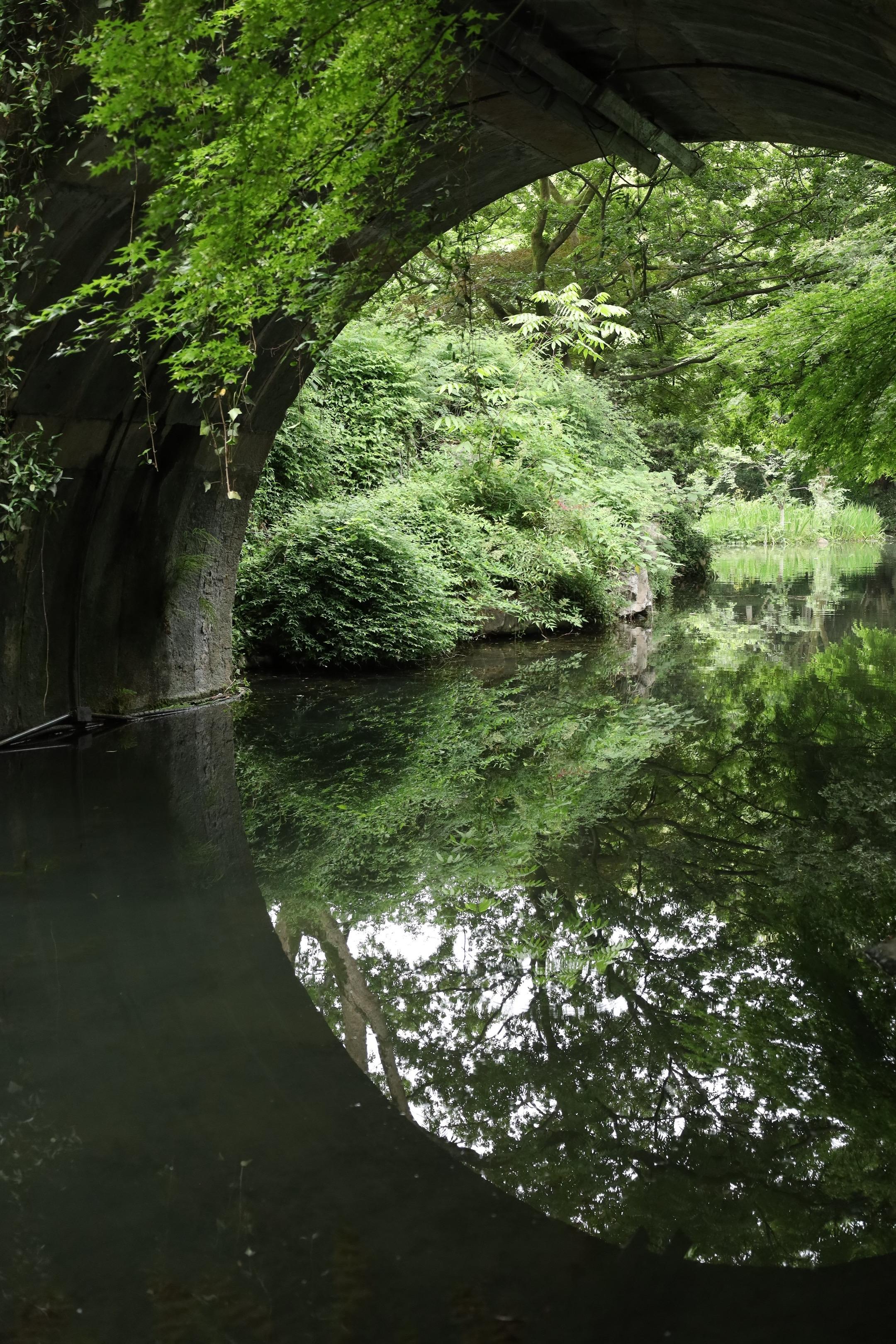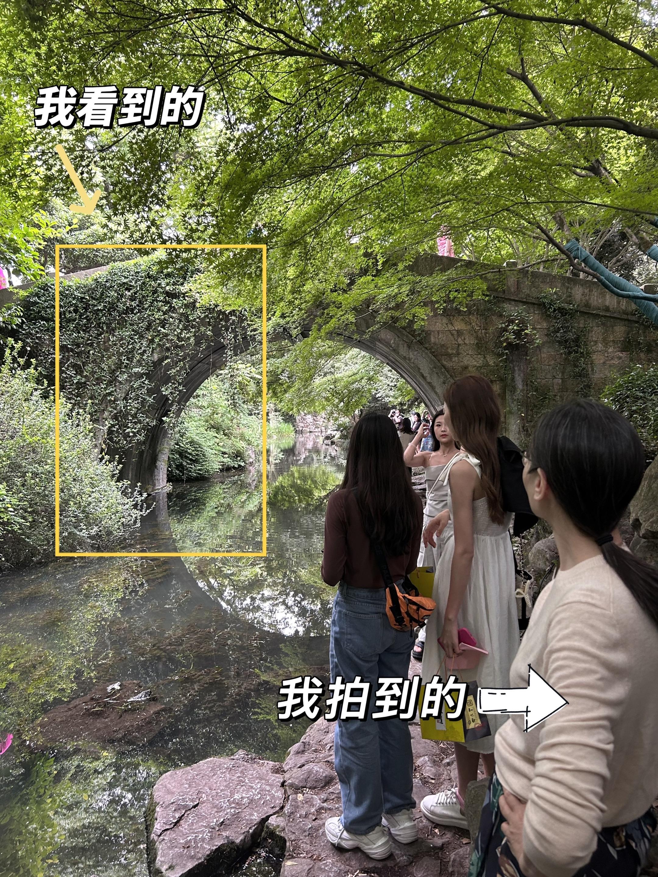 当我发现一个很美的中式桥洞。1. 框景构图:以桥洞为天然画框,聚焦洞外绿树、亭台或水面, 2. 对称倒影:水平拍摄,利用水面倒影形成对称。 3. 延伸引导:低角度贴近水面,让桥洞线条向远方延伸,增强纵深感。