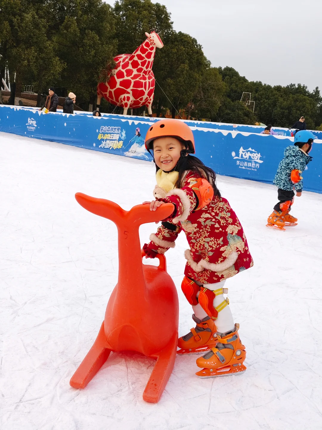 穿着溜冰鞋⛸️滑冰太赞了吧,还有溜冰助手可以租!头盔🪖护膝一个都不少,对小宝宝很安全,放心冲哦!