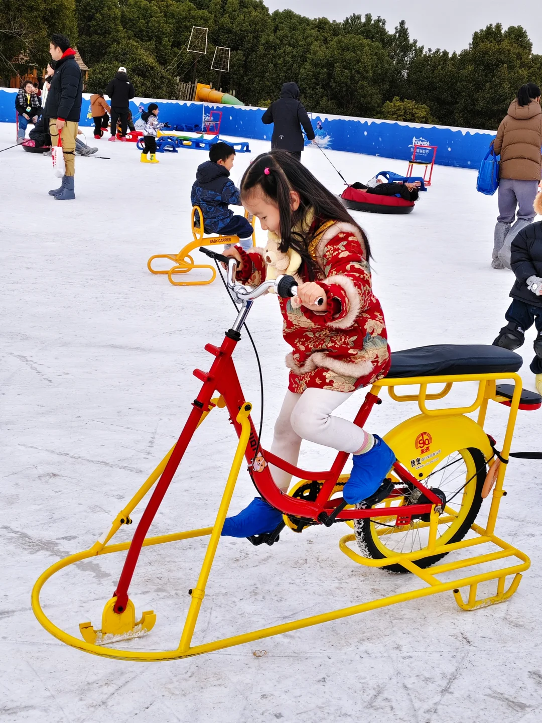 ✔️天然远山冰场:有自由嬉冰区和冰上娱乐区,新手友好,冰自行车、冰爬犁小丸子好喜欢,拉着爸爸妈妈在冰上🧊奔跑,真的很快乐哦!