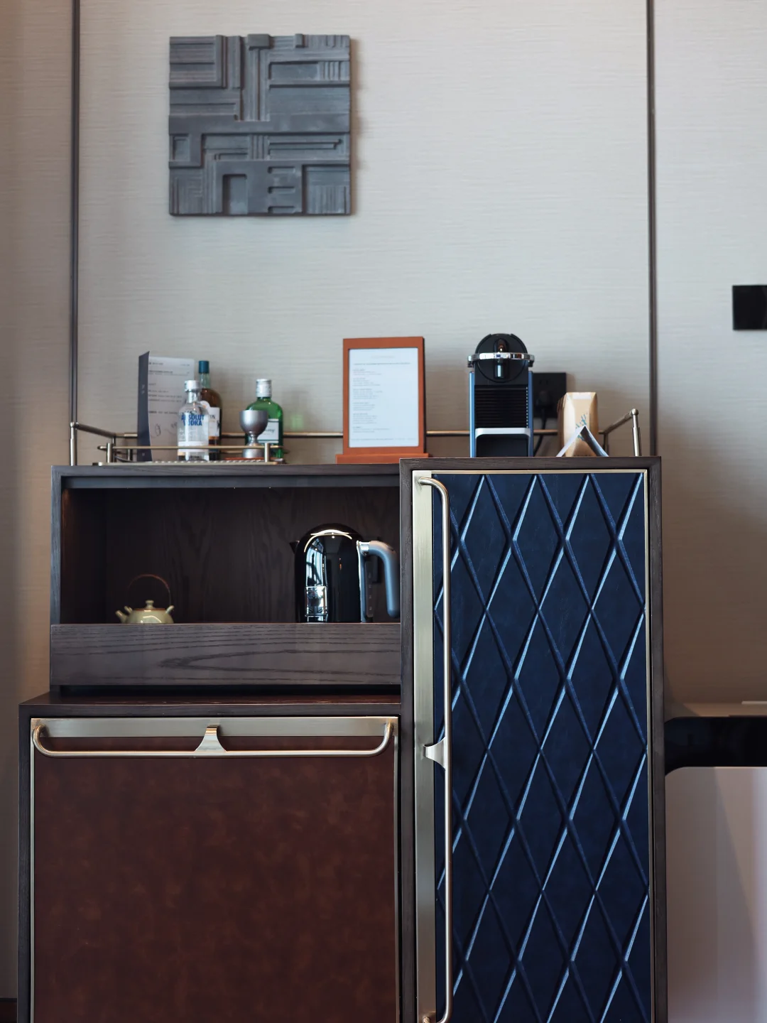🩵细节缱绻:房间的质感藏在触摸之间。木制地板光脚踩上去的温润,定制家具的细腻纹理,还有以展馆艺术为灵感的装饰点缀