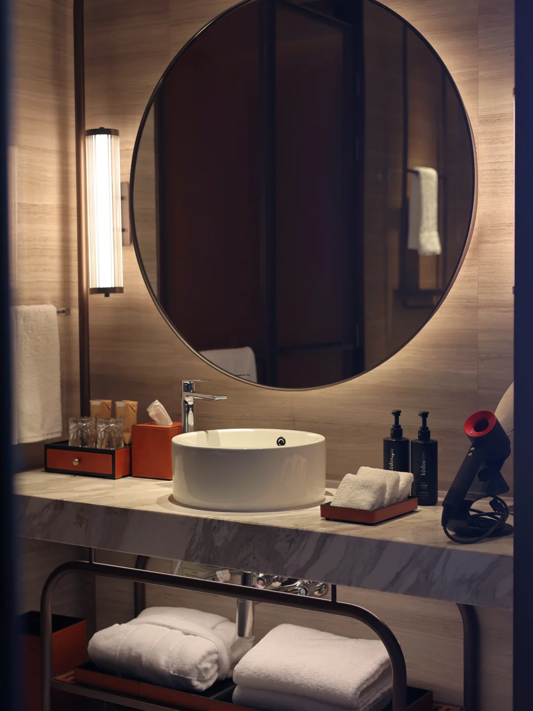 🔘它的设计灵感,来自酒店所在的这片土地——2010年上海世博会的展馆,巧妙构建了一个“馆中馆”的叙事空间。你能看到简洁的钢结构致敬着场地的工业记忆,而温暖的木质、柔软的天鹅绒又与之温柔对话,这种钢与木、复古与当代的对比美学,就是它最迷人的语言。