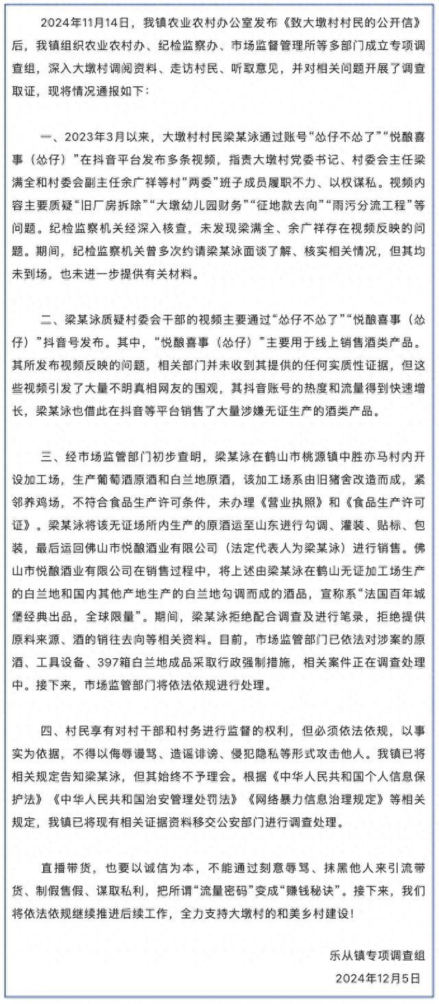 2024年12月5日,乐从镇专项调查组发布情况通报:纪检监察机关经深入核查,未发现梁满全、余广祥存在视频反映的问题。期间,纪检监察机关曾多次约请梁某某面谈了解、核实相关情况,但其均未到场,也未进一步提供有关材料。