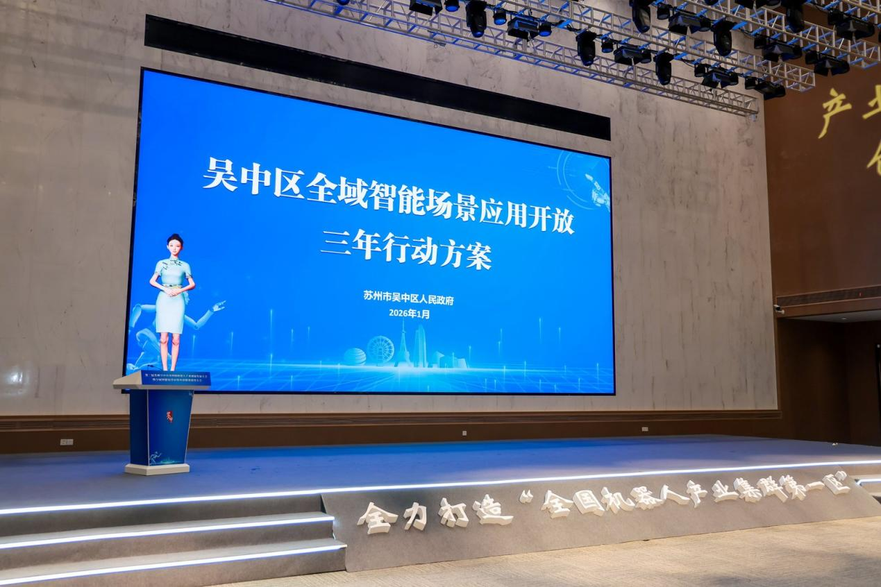 大会上,由全新上线的数字主持人“碧螺仙子”主持发布国内首个具身智能机器人领域全域场景开放方案——《吴中区全域智能场景应用开放三年行动方案》(下称“方案”)。《方案》提出,未来三年,吴中区将大力推进“百千万”行动,即引育100家机器人整机企业、打造1000个落地应用场景、部署10000台智能机器人,让机器人从产线走进生产生活的方方面面。结合吴中区实际,《方案》提出优化应用产品供给、提升数据采集能力、加快中试验证落地、推进场景资源开放、创新场景招商模式、深化供需对接活动、强化创新主体地位、培育智能终端产品、打造场景创新平台、提高场景服务水平、健全政策支持体系、强化专业人才引育、完善基础设施建设等13条具体举措,系统性推进具身智能场景培育。