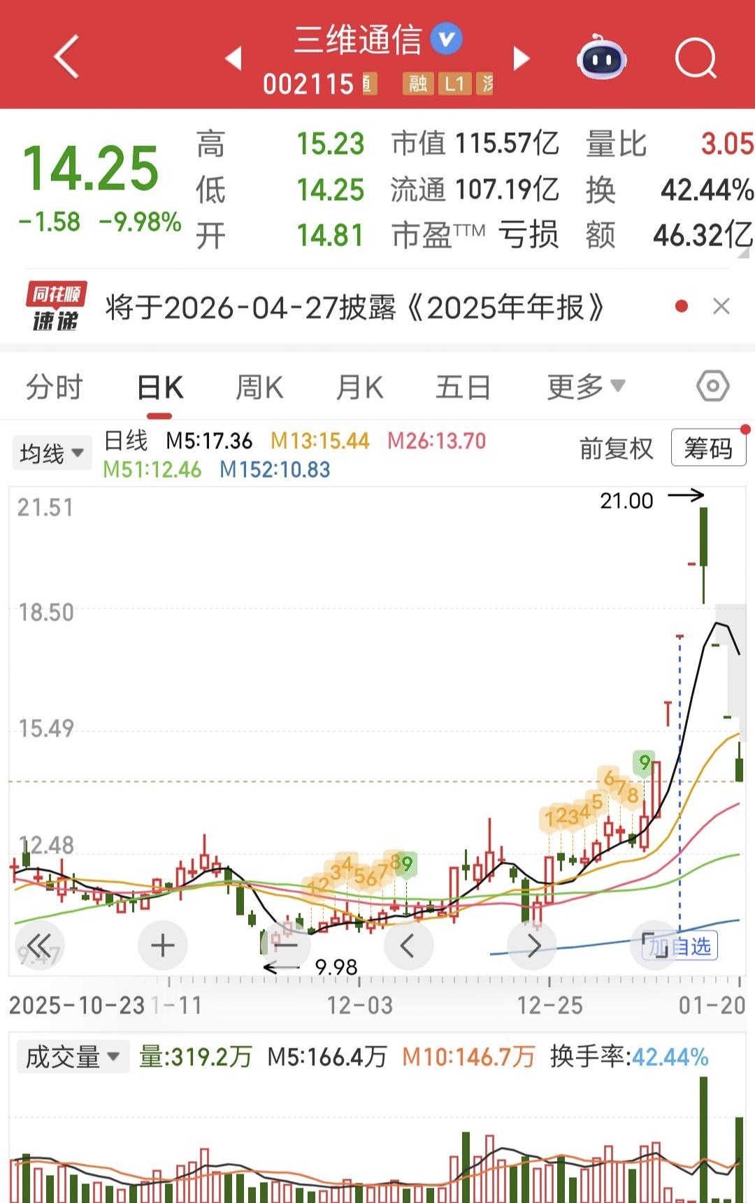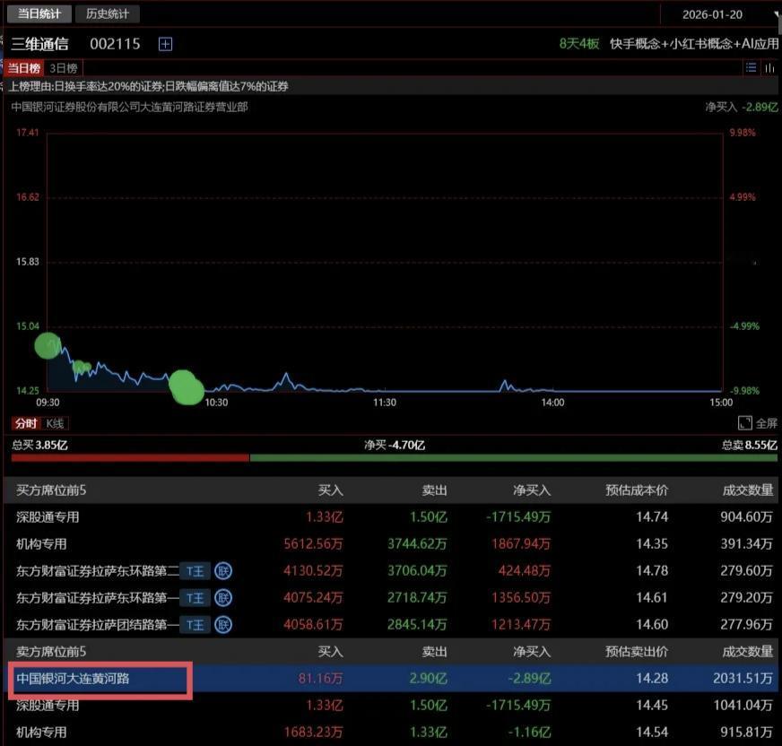 陈小群2.9亿割肉! 今天三维通信继续跌停。 盘后龙虎榜显示,陈小群割肉三维通信,砸出2.9个亿,该股全天成交46.3亿,占比6.2%。 这票下来也是3个跌停,这波热门股杀得太凶了。 涨停板
