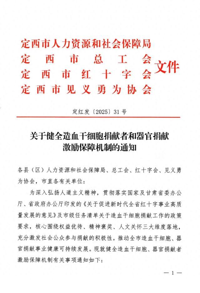 为深入弘扬人道主义精神,践行社会主义核心价值观,定西市红十字会积极探索创新捐献激励机制,联合市人力资源和社会保障局、总工会、见义勇为协会,共同出台《关于健全造血干细胞捐献者和器官捐献激励保障机制的通知》(定红发〔2025〕31号),明确将成功捐献造血干细胞与遗体器官捐献行为正式纳入见义勇为评定范围。
