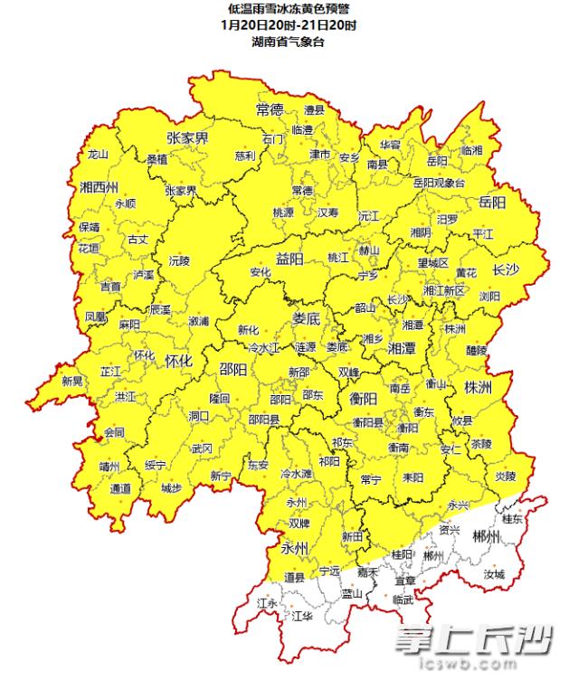 记者注意到,省气象台已于今日16时发布低温雨雪冰冻黄色预警,预计20日20时到21日20时,长沙、株洲、湘潭、衡阳、邵阳、岳阳、常德、张家界、益阳、郴州北部、永州中北部、怀化、娄底、湘西州将出现雨凇或积雪,且最低气温在0℃或以下。