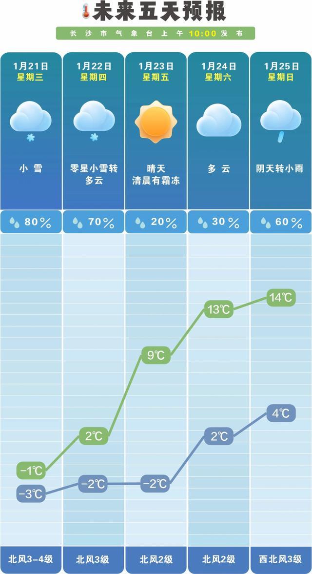 根据长沙市气象台最新预计,21日长沙小雪,气温-3℃至-1℃;21日到22日白天,小雪转多云;22日晚至24日,天气转好,多云为主;25日到27日,高空波动影响,有小雨。
