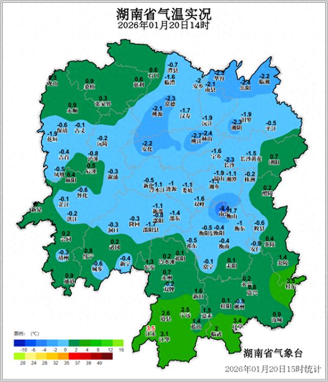 长沙晚报掌上长沙1月20日讯(全媒体记者舒元臻实习生邹笑榕)今日进入二十四节气的终章——大寒。寒气之逆极,故谓大寒。作为反映寒冷程度的节气,大寒时节全国大部此时都处在低温时段。湖南的天气也十分应景,多地出现冻雨、冰粒或雪,气温低迷。记者从湖南省气象台了解到,今日14时,湖南大部分地区气温低于0℃,其中长沙-2.3℃!但好消息是,最严峻的时段即将过去,过两天将迎来几天宝贵的回暖,本周末长沙最高气温将升至14℃。