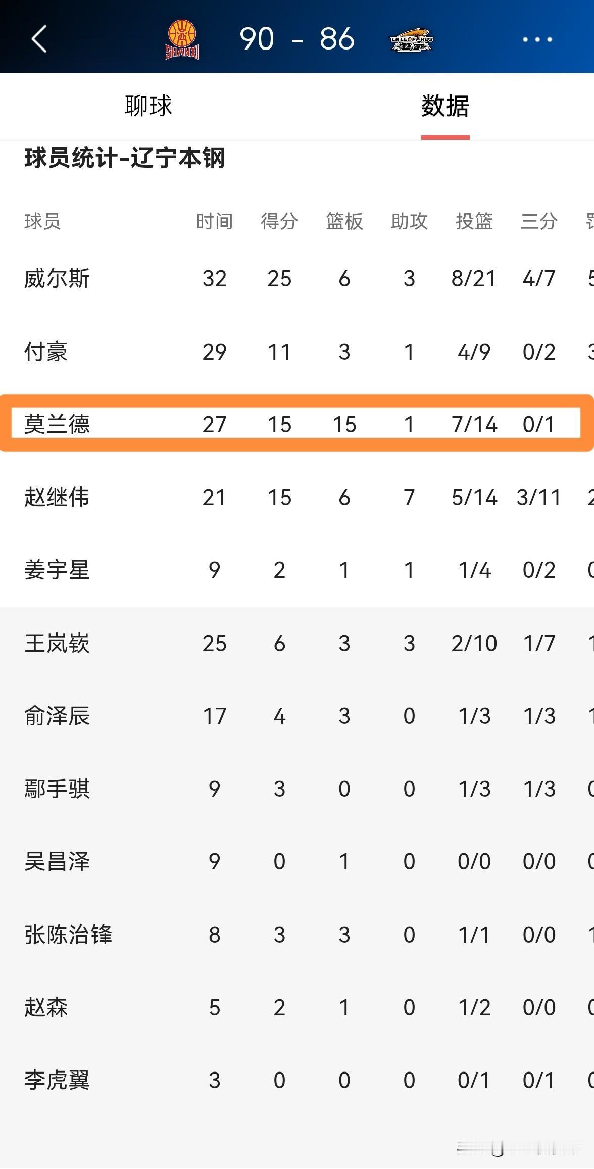 辽宁本钢外援莫兰德真是虽败犹荣!虽然今天辽宁本钢在客场以86:90惜败于山西汾酒,但是老将莫兰德在攻防两端都打出了可圈可点的表现。全场比赛下来,莫兰德首发出战27分钟,投篮14中7,其中三分球1中0、罚球2中1得到15分15篮板3抢断1盖帽,他的场上正负值为+3。 值得一提的是,在赵继伟伤愈复出以后,我发现莫兰德的比赛积极性得到了明显的增强,最近几场比赛,莫兰德在攻防两端都拼劲十足。