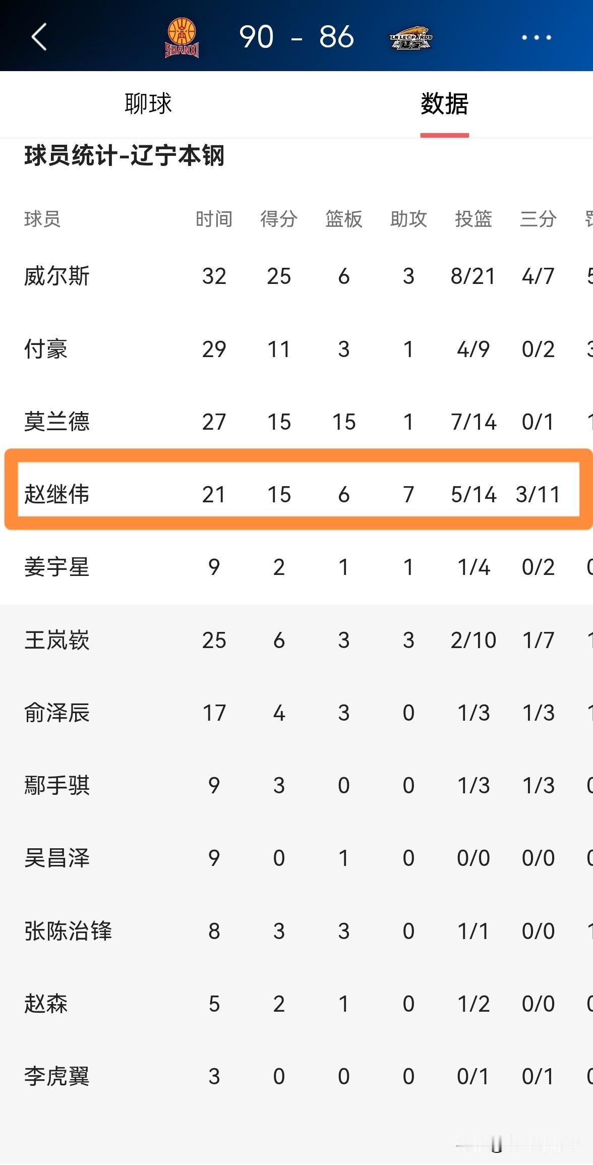 我强烈建议辽宁本钢巨星赵继伟不要浪投三分了!在今天辽宁本钢客场以86:90不敌山西汾酒的比赛中,赵继伟在三分线外疯狂的出手11次,却只进了3球,他的三分球命中率真是低的可怜。 全场比赛下来,赵继伟首发出战21分钟,投篮14中5,其中三分球11中3、罚球3中2非常低效的得到15分,还有2次失误,他的场上正负值为-5。 实事求是的说,作为辽宁本钢的核心控卫,赵继伟的本质工作是为队友创造好的得分机会,而不是一味地浪投三分。