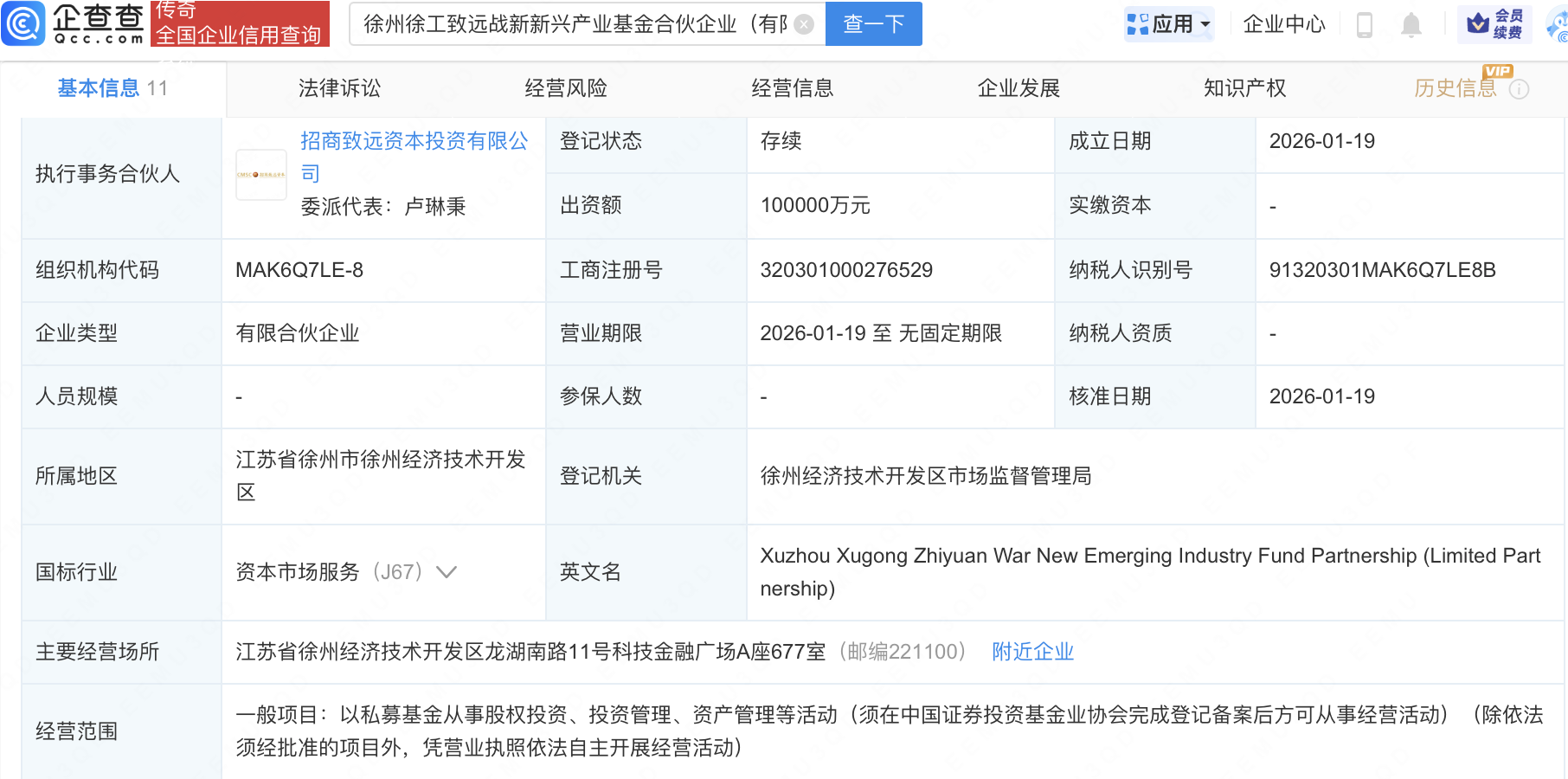 企查查APP显示,近日,徐州徐工致远战新新兴产业基金合伙企业(有限合伙)成立,出资额10亿元,经营范围包含:以私募基金从事股权投资、投资管理、资产管理等活动。企查查股权穿透显示,该企业由招商证券(600999)全资子公司招商致远资本投资有限公司、徐州工程机械集团有限公司全资子公司徐工集团产业投资发展(徐州)有限公司等共同出资。