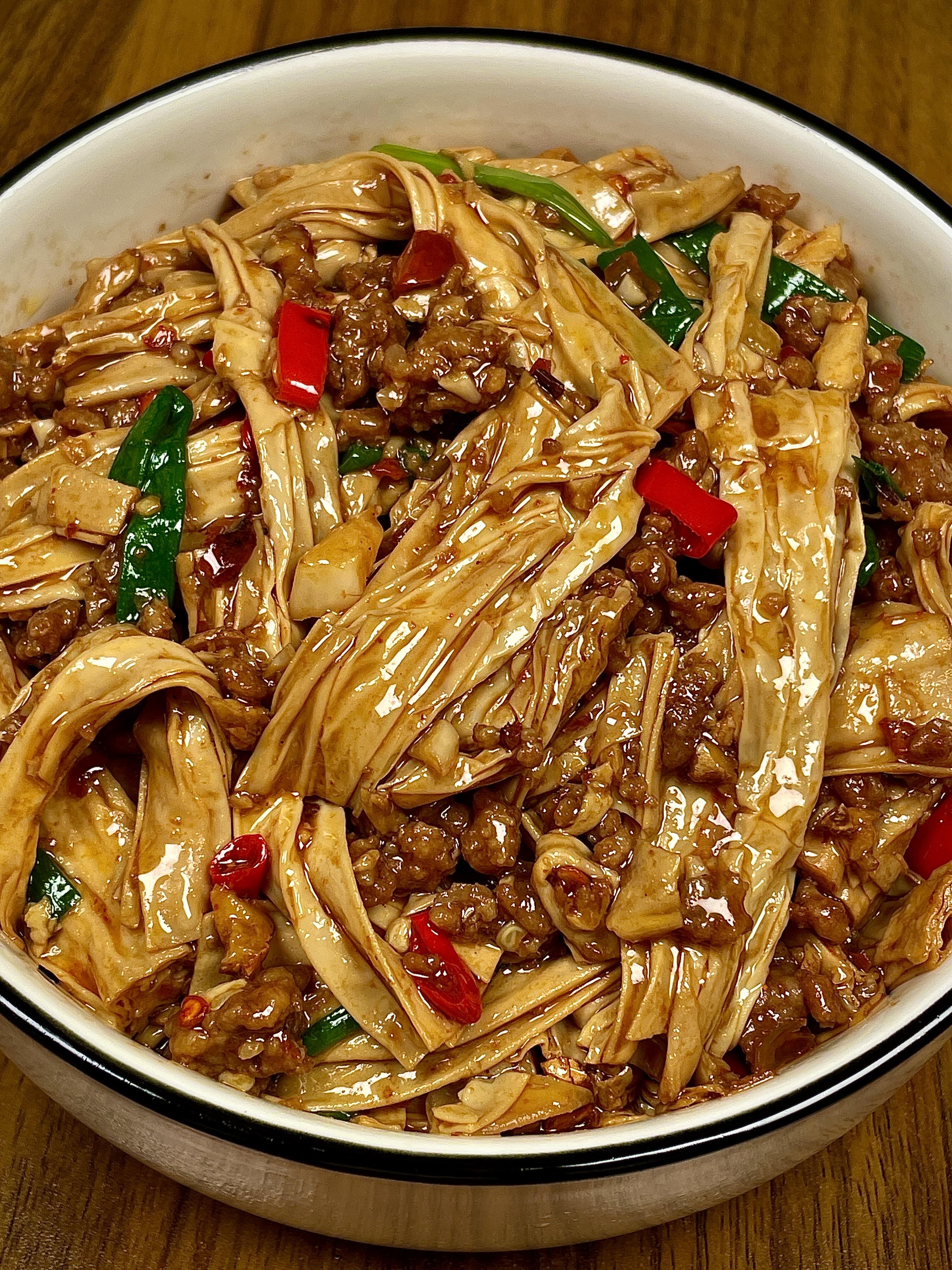 腐竹炒肉的可塑性极强!喜欢麻辣口味的,可以在爆香时加入干辣椒和花椒;素食者可以把肉换成香菇或杏鲍菇,做成素版腐竹炒“肉”;想要更丰富口感,可以加入木耳、胡萝卜片一起炒。记得几个小窍门:腐竹泡发要适度,太硬影响口感,太软容易炒碎;肉片滑炒时间不宜过长,变色即可;酱汁中的糖能提鲜并平衡咸味,最好不要省略。