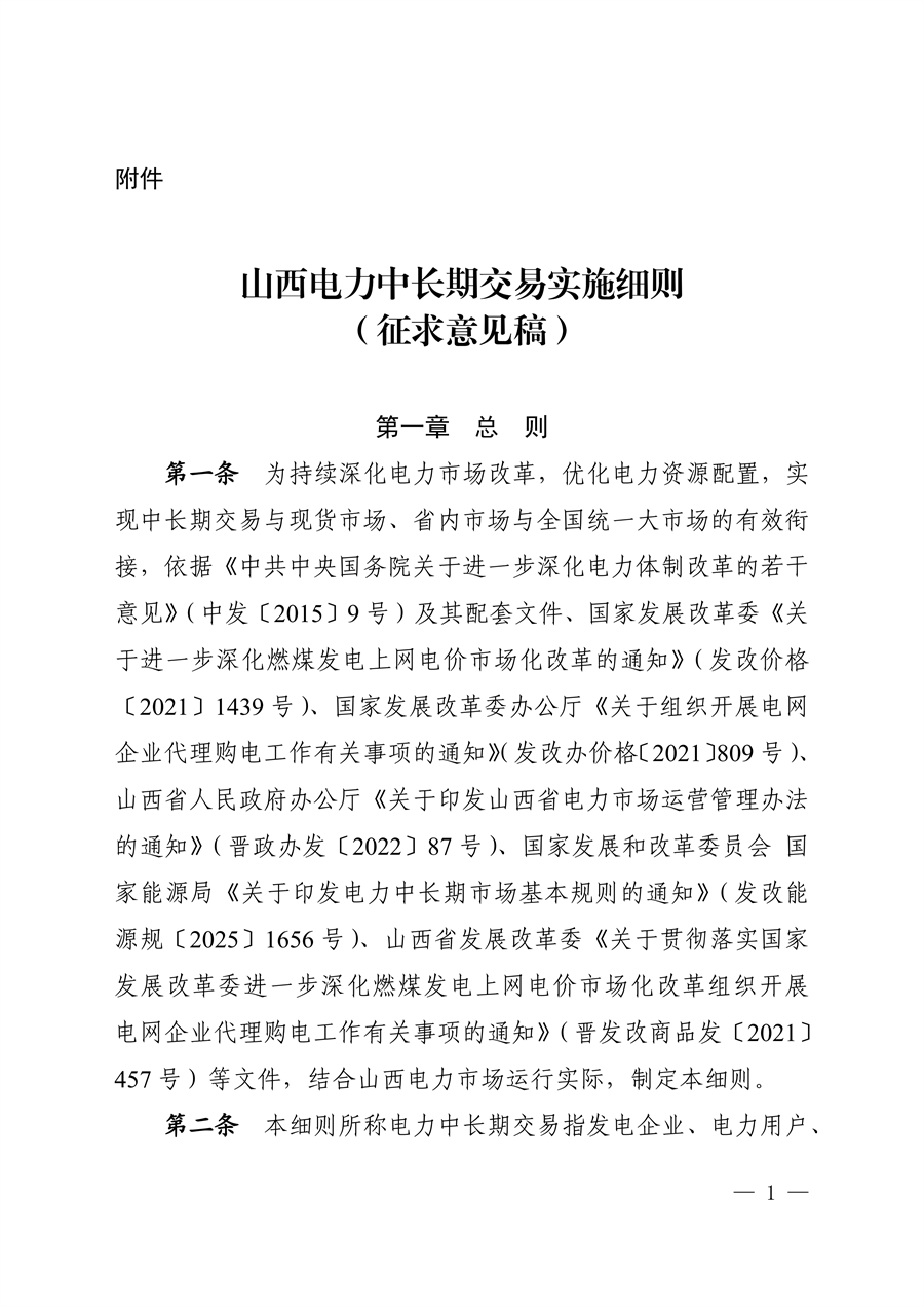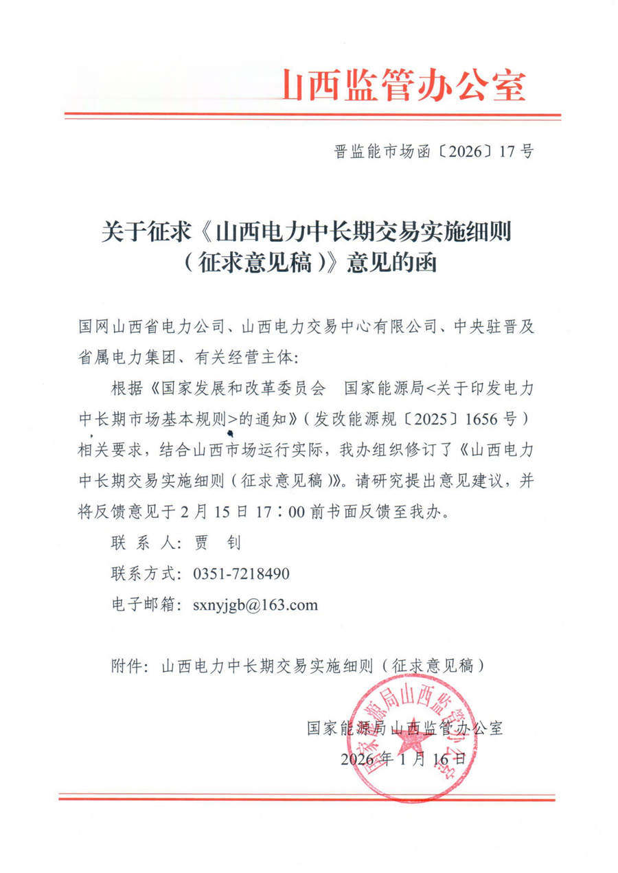 1月16日,山西能监办发布关于征求《山西电力中长期交易实施细则(征求意见稿)》意见的函。文件提到,在电力现货市场运行期间组织开展电力中长期分时段交易。