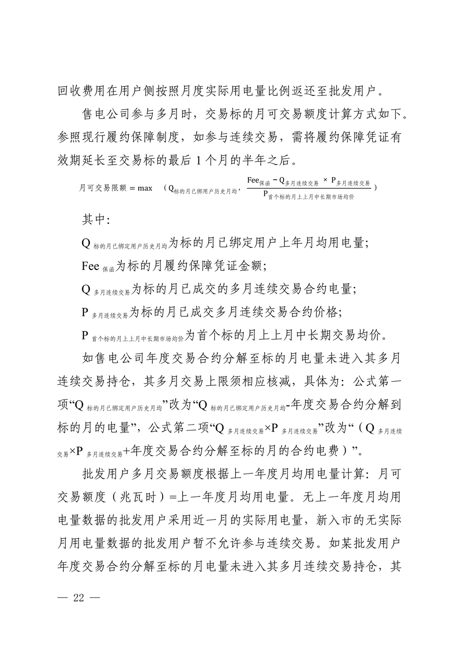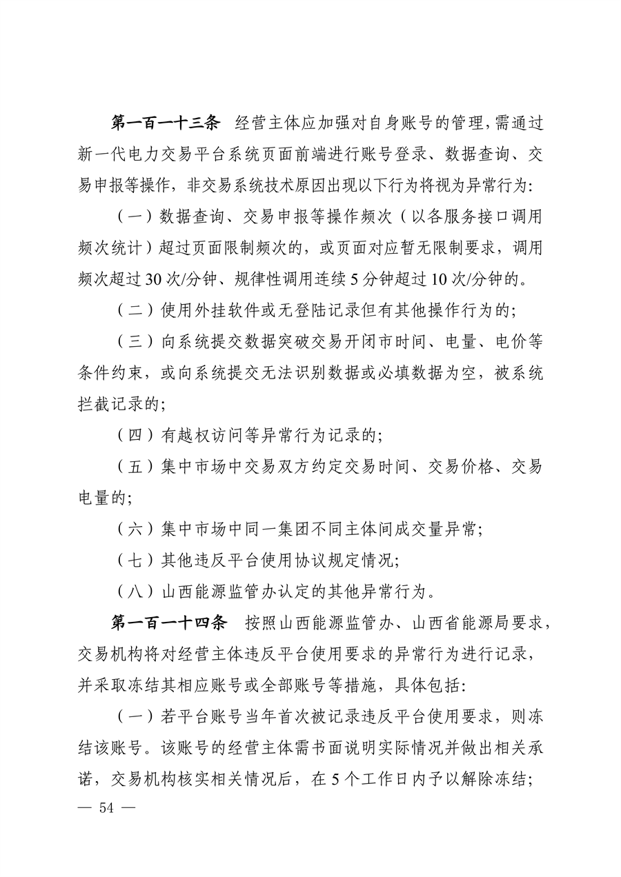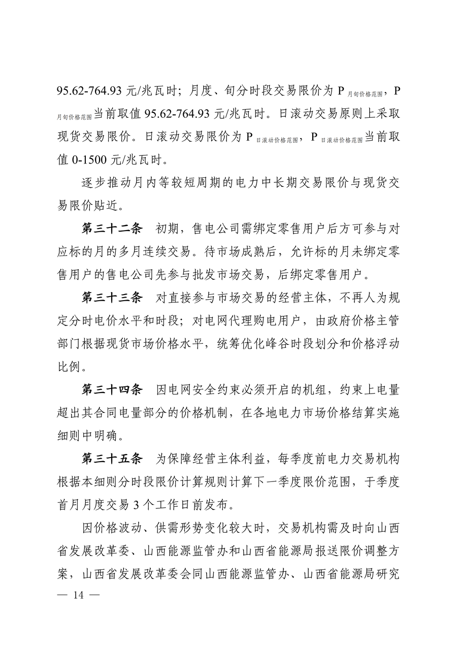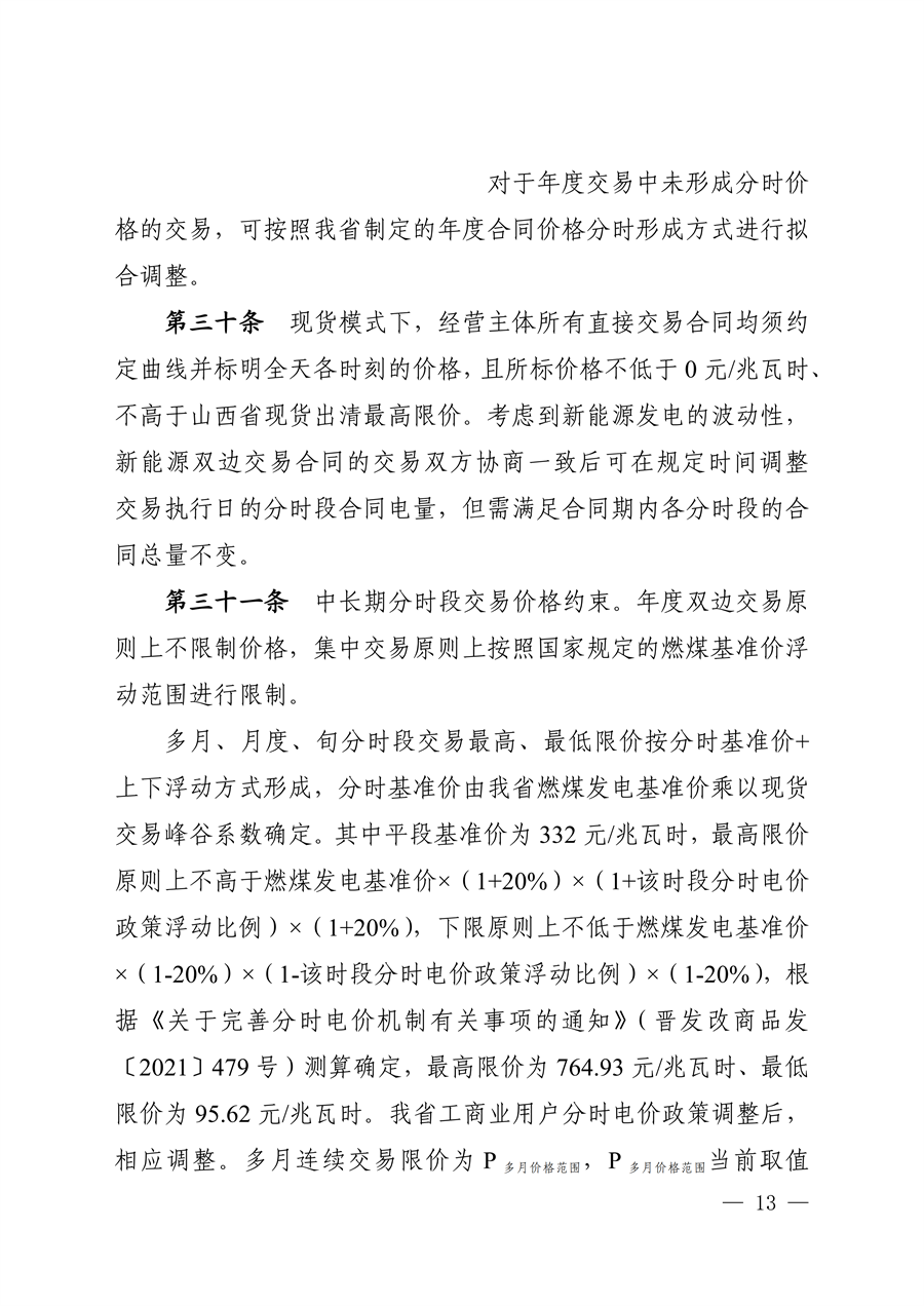 多月、月度、旬分时段交易最高、最低限价按分时基准价+上下浮动方式形成,分时基准价由山西省燃煤发电基准价乘以现货交易峰谷系数确定。其中平段基准价为332元/兆瓦时,最高限价原则上不高于燃煤发电基准价×(1+20%)×(1+该时段分时电价政策浮动比例)×(1+20%),下限原则上不低于燃煤发电基准价×(1-20%)×(1-该时段分时电价政策浮动比例)×(1-20%),根据《关于完善分时电价机制有关事项的通知》(晋发改商品发〔2021〕479号)测算确定,最高限价为764.93元/兆瓦时、最低限价为95.62元/兆瓦时。山西省工商业用户分时电价政策调整后,相应调整。多月连续交易限价为P多月价格范围,P多月价格范围当前取值95.62-764.93元/兆瓦时;月度、旬分时段交易限价为P月旬价格范围,P月旬价格范围当前取值95.62-764.93元/兆瓦时。日滚动交易原则上采取现货交易限价。日滚动交易限价为P日滚动价格范围,P日滚动价格范围当前取值0-1500元/兆瓦时。逐步推动月内等较短周期的电力中长期交易限价与现货交易限价贴近。