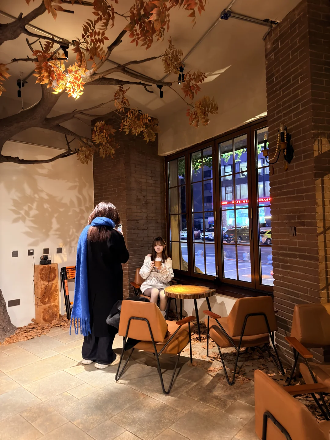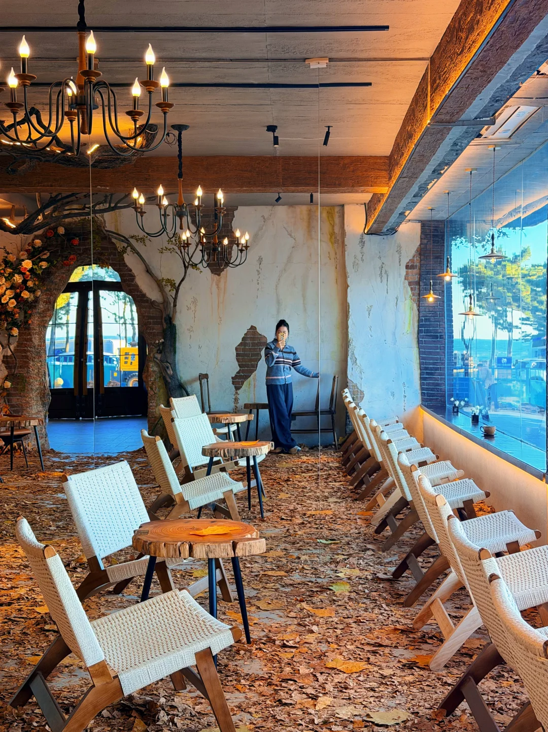 D1层有大大的落地窗看海,室内地上铺满了枫叶🍁,氛围感敲强,很出片!