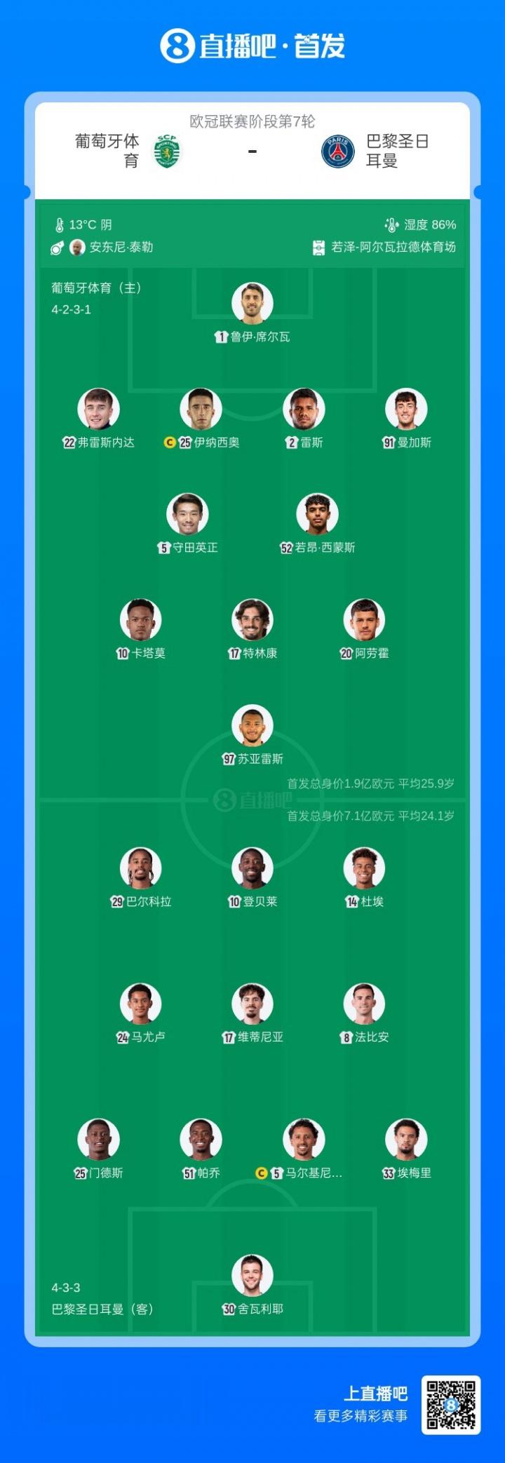 直播吧1月21日讯欧冠联赛阶段第7轮,巴黎圣日耳曼客战葡萄牙体育,赛前双方首发公布。