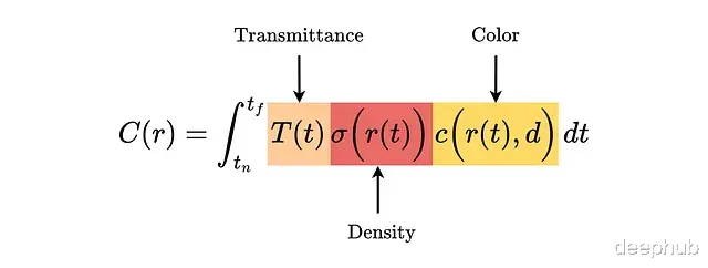 光线的期望颜色C(r)定义如下,沿光线从近到远积分: