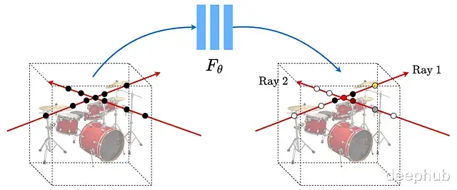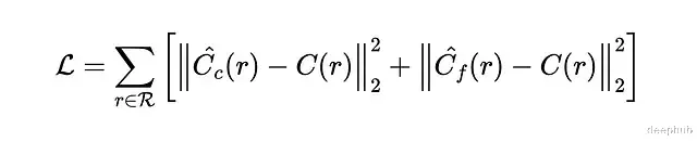 先用粗糙网络采样评估一批点,再根据结果用逆变换采样在重要区域加密采样。精细网络用两组样本一起计算最终颜色。粗糙网络的颜色可以写成采样颜色的加权和。