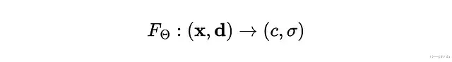 输入是位置 x = (x, y, z) 和观察方向 d = (θ, φ),输出是颜色 c = (r, g, b) 和密度 σ。整个5D映射用MLP来近似。