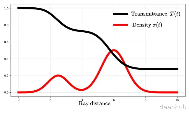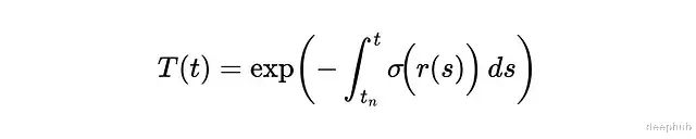密度σ描述的是某点对光线的阻挡程度,可以理解为吸收概率。更严格地说它是光线在该点终止的微分概率。根据这个定义,光线从t传播到tₙ的透射概率可以表示为: