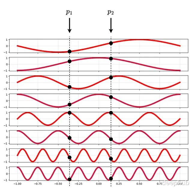 γ对每个坐标分别应用,是个确定性函数没有可学习参数。p归一化到[-1,+1]。L=4时的编码可视化: