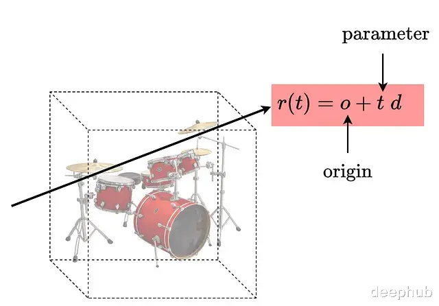 def render_rays(model, ro, rd, near=2.0, far=6.0, N=64): # sample along the ray t = torch.linspace(near, far, N, device=ro.device) pts = ro[:, None, :] + rd[:, None, :] * t[None, :, None] # r = o + td # attach view directions to each sample # each point knows where the ray comes from dirs = rd[:, None, :].expand_as(pts) # query NeRF at each point and reshape rgb, sigma = model(pts.reshape(-1,3), dirs.reshape(-1,3)) rgb = rgb.reshape(ro.shape[0], N, 3) sigma = sigma.reshape(ro.shape[0], N) # compute the distance between the samples delta = t[1:] - t[:-1] delta = torch.cat([delta, torch.tensor([1e10], device=ro.device)]) # convert density into opacity alpha = 1 - torch.exp(-sigma * delta) # compute transmittance along the ray T = torch.cumprod(torch.cat([torch.ones((ro.shape[0],1), device=ro.device), 1 - alpha + 1e-10], dim=-1), dim=-1)[:, :-1] weights = T * alpha return (weights[...,None] * rgb).sum(dim=1) # accumulate the colors