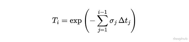 Tᵢ是光线存活到第i个区间之前的概率。那光线在第i个区间内终止的概率呢?可以用密度来算: