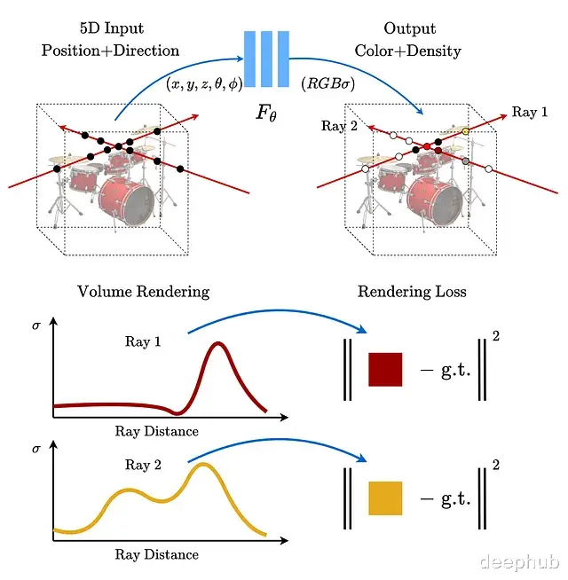 渲染流程分三步:沿每条光线采样生成3D点,用网络预测每个点的颜色和密度,最后用体积渲染把这些颜色累积成二维图像。