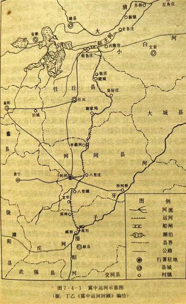冀中运河南起献县臧桥高坦村,沿冯家河旧道向北,过商林,到河间县的南八里庄与古洋河故道相接,后曲折北上,经徐家口、半截河至大李庄进入任丘县,复经麻家坞、吴好庄向西北,过陵城至张庄万寿桥,穿过五官淀,北行接小河,最后于文安县苟各庄汇入赵王河。同时,在河间县东八里庄向西开挖3公里的引河。冀中运河开凿96公里至苟各庄,已经连通了子牙河与大清河、白洋淀之间的水运航道。随着解放军向平津地区的推进,支前物资可以通过这条纵贯冀中南北的运河,北上入大清河,运至天津战役的前线,还可以从苟各庄走陆运,运送前线所需的各种物资(见题图)。