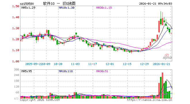 1月21日,软件50ETF(159590)开盘跌1.03%,报1.245元。软件50ETF(159590)重仓股方面,科大讯飞开盘跌1.02%,同花顺涨1.44%,金山办公跌0.30%,指南针跌0.35%,恒生电子跌0.62%,润和软件跌0.83%,三六零跌0.81%,拓维信息跌0.78%,用友网络跌0.99%。