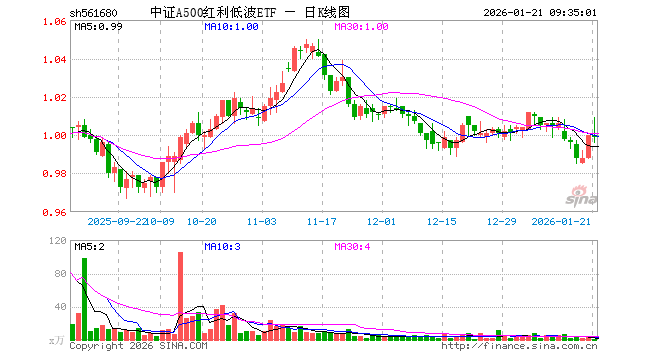1月21日,中证A500红利低波ETF(561680)开盘涨0.00%,报1.000元。中证A500红利低波ETF(561680)重仓股方面,农业银行开盘涨0.14%,雅戈尔涨0.14%,交通银行涨0.29%,中国银行涨0.00%,中国神华涨0.32%,云天化跌0.06%,江苏银行跌0.10%,工商银行跌0.13%,邮储银行涨0.00%,格力电器涨0.05%。