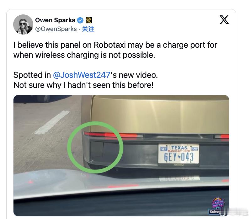 谍照显示,特斯拉Cybercab可能提供两种充电方式特斯拉在2024年发布Cybercab时曾表示,这款自动驾驶双座车将采用无线充电技术。然而,自那以后,特斯拉一直对这套充电系统的具体部署时间表保持沉默。鉴于Cybercab预计将在几个月内投产,而无线充电遥遥无期,为它配备实体NACS接口更加靠谱。最近不少网友拍到了Cybercab原型车的视频,有人发现车尾可能藏着玄机。在车尾能看到一个面板,它的尺寸足够大,足以容纳一个实体充电接口。如果猜测成立,这意味着Cybercab拥有多重充电方案,为其运营提供了更大的灵活性,对于一款无人出租车来说,拥有多种充电方案的冗余设计无疑是明智之举。