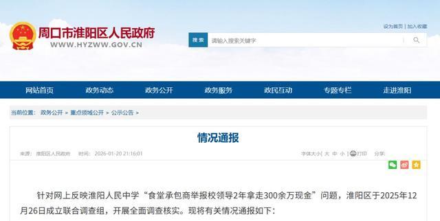 针对网上反映淮阳人民中学“食堂承包商举报校领导2年拿走300余万现金”问题,淮阳区于2025年12月26日成立联合调查组,开展全面调查核实。现将有关情况通报如下: