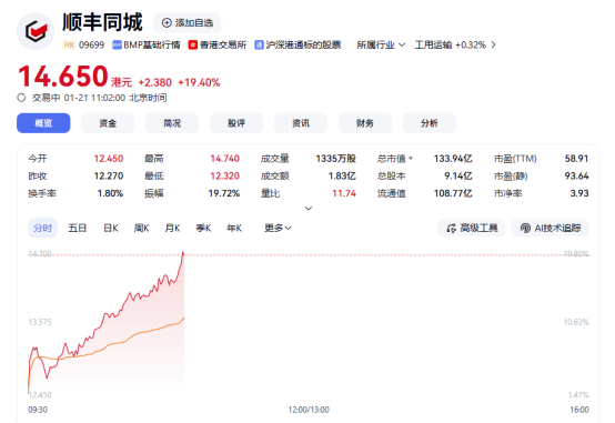 上证报中国证券网讯(李子健记者周亮)1月21日,港股顺丰同城股价高开高走。截至11时02分,公司股价上涨19.40%,报14.65港元/股。自1月19日以来,顺丰同城股价已连涨3天。