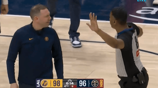 第四节比赛中,拉拉维亚掉球、判湖人底线球,阿德尔曼冲进场内申请挑战。