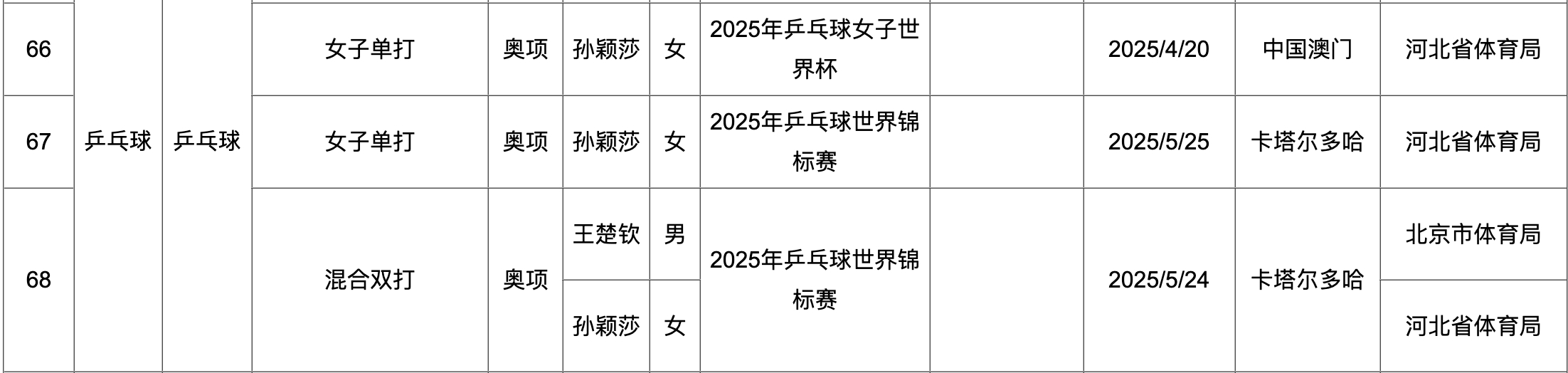国家体育总局官网2025年我国运动员获世界冠军统计恭喜孙颖莎选手荣获4个世界冠军,其中2个单打世冠,包揽全年三大赛单打世界冠军且世冠总数不分男女第一☝🏻66 奥项 2025年乒乓球女子世界杯女单冠军67 奥项 2025年乒乓球世界锦标赛女单冠军68 奥项 2025年乒乓球世界锦标赛混双冠军69 奥项 2025年乒乓球世界杯混合团体冠军 孙颖莎