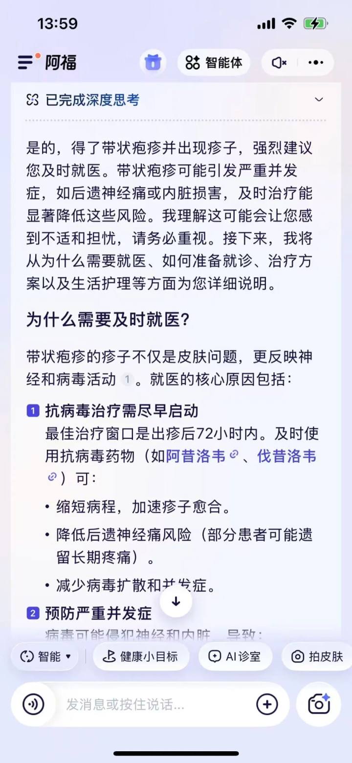 阿福初步分析后,提示“考虑带状疱疹可能性,建议及时就医确认。”为了稳妥起见,胡先生又问了另一个AI工具,得到的建议同样是优先需排查带状疱疹。