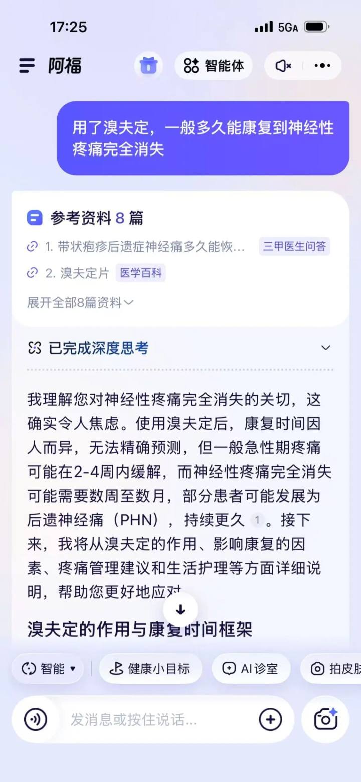 有了这次经历,胡先生在拿到药后还特意用AI咨询了一堆后续问题:用了抗病毒药物后一般多久能康复到神经性疼痛完全消失?带状疱疹得过之后有终生免疫吗,还会复发吗?还需要再打疫苗吗?