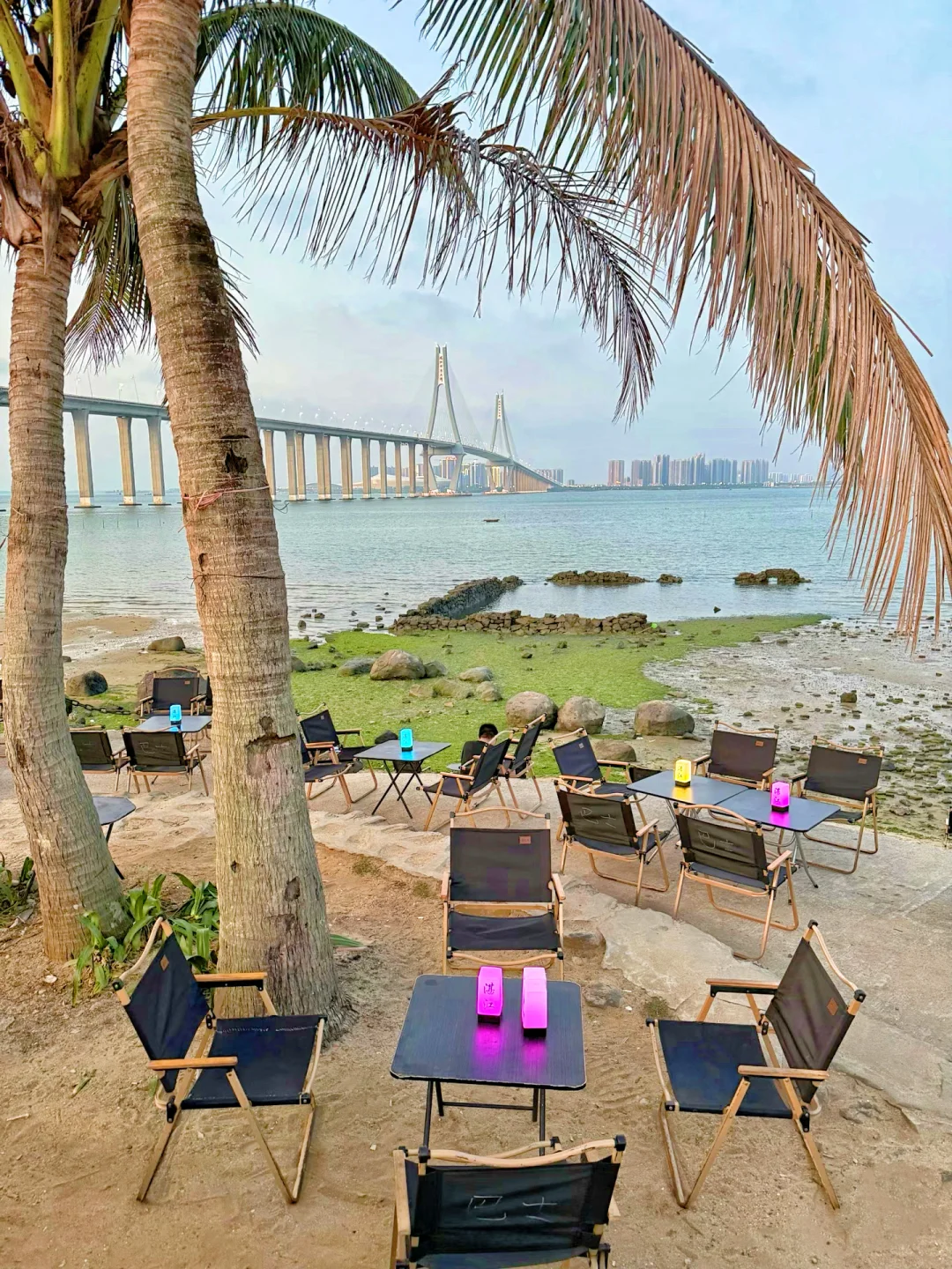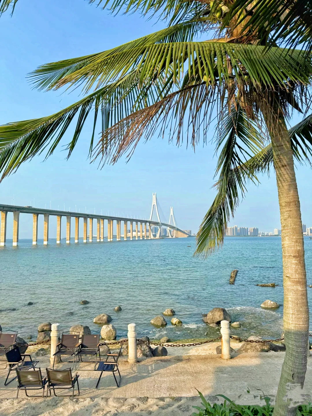 是少有的“城在海边、还在城中”的景观,有阳光的时候特出片,走在沙滩上,漫步走椰树大道中,微风吹拂,舒服极了,妥妥的碧海蓝天度假风。强烈推荐去海边的咖啡屋喝一杯咖啡,一遍咖啡,一遍看着窗外远处的湛江海湾大桥,碧海,摇椅的椰树,沙滩,美哉美哉