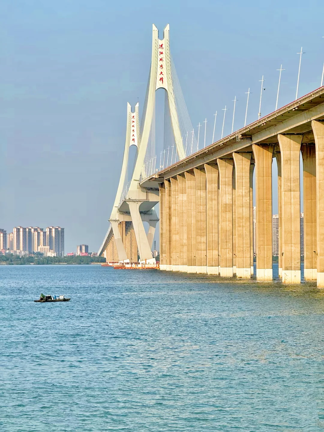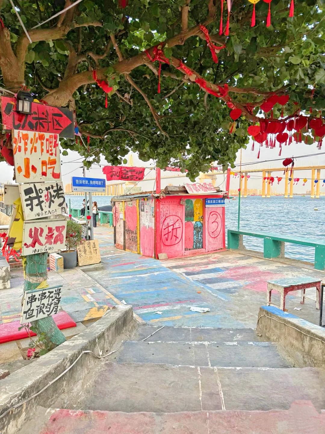 湛江海湾大桥下面很出片,有时候有民间歌手唱歌,坐在那吹着海风,听着现场演绎,挺舒服。离中澳友谊花园走路大概5分钟有一个网络打卡点,海边涂鸦墙,在荣盛中央广场B区马路对面