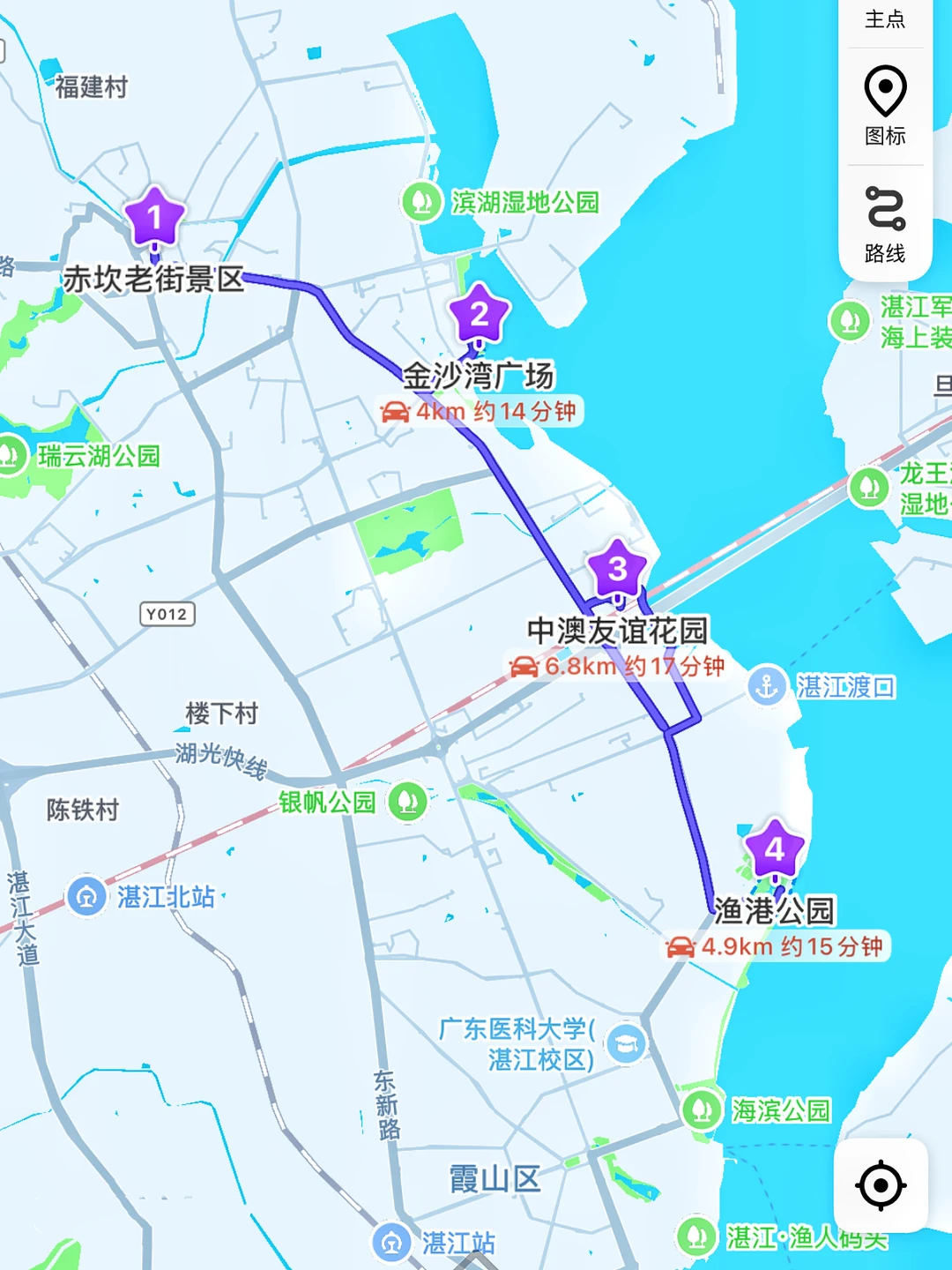本利士多店→8号码头→水仙庙→静园→文艺废青聚集地→大昌商铺→7号码头→明德艺术馆→赤坎区博物馆→6号码头→蚝壳墙→广州湾商会会址→水井油条→马三姐(海鲜捞粉、虾饼)→老街文化集市→广州湾历史民俗馆