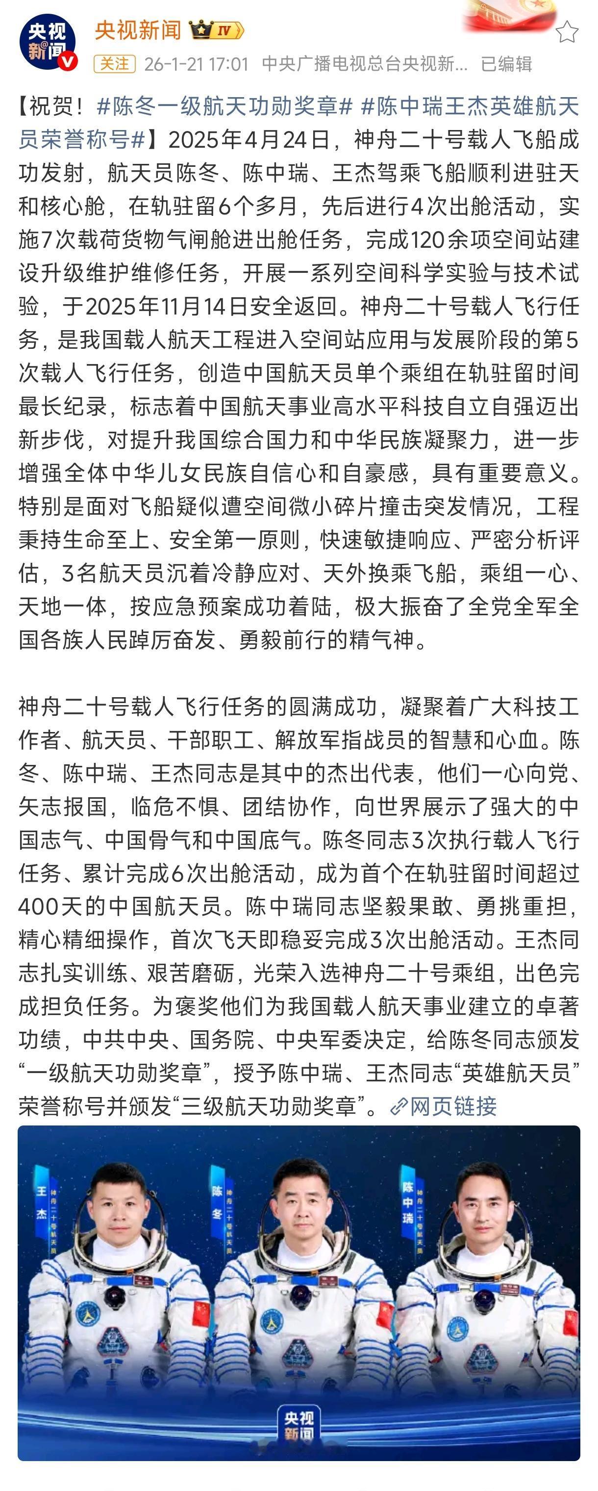 神舟二十号那三位航天员,今天拿到最高荣誉了。 就去年那会儿,陈冬、陈中瑞、王杰他们仨,在天上待了六个月。本来一切按部就班,可偏偏遇上了突发情况——飞船疑似被空间碎片撞了。四百公里高的地方,出一点岔子都是要命的事。可你看,从地面指挥到天上三位,硬是稳住了,最后平平安安落回地球。 今天,表彰来了。陈冬拿了“一级航天功勋奖章”,陈中瑞和王杰被授予“英雄航天员”,还拿了“三级航天功勋奖章”。要我说,这荣誉,给得一点不亏。 尤其陈冬,这已经是他第三次上天了,光是出舱就干了六回,在轨时间加起来超过四百天,实打实的老将。另外两位虽然是第一次,可那表现,一点不怂。面对突发危险那份冷静,真不是练练就能有的。 我总觉得,每次给航天员颁奖,背后意义远不止奖励几个人。它是在告诉所有埋头干事的航天人:你们每一次拼尽全力,国家都记得。这行太苦了,训练苦,离别苦,在太空中面对未知的那种压力,更不是常人能想象的。没点精神撑着,真干不下来。 从只能看着别人上天,到如今咱们自己的空间站建成了,航天员一批批上去,遇到意外也能从容应对——这条路,是靠一个个像陈冬他们这样的人,用实实在在的风险和汗水趟出来的。 今天这份表彰,是给过去的付出一个交代,更是给未来的征途点亮一盏灯。星辰大海的路还长,但有人这样一步一个脚印地走,咱们心里,就踏实。