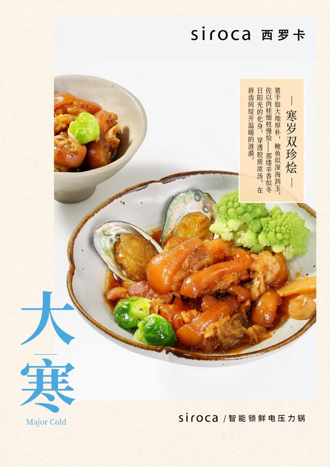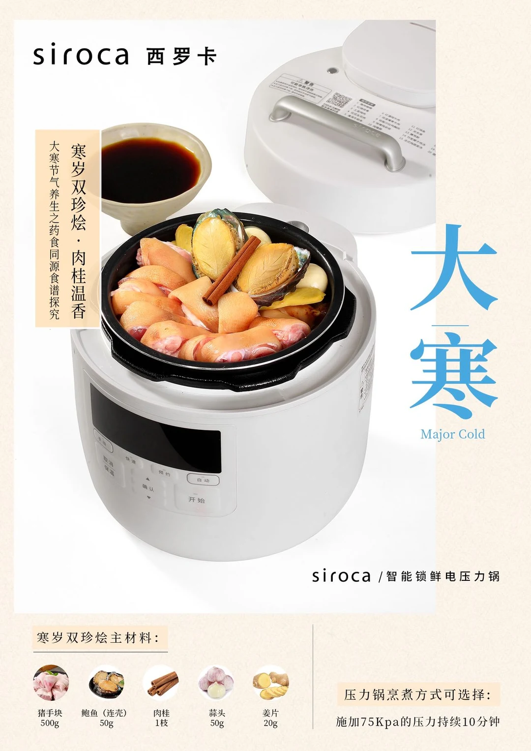 作为一年中最冷的日子,一碗热乎的硬菜,新年就被暖暖的开启了。 今天用西罗卡智能锁鲜电压力锅做了「寒岁双珍烩」猪手+鲍鱼+肉桂的神仙组合,是老祖宗传下来的药食同源暖方✨ 75KPa高压焖煮10分钟就搞定,猪手炖到轻轻一抿就脱骨,鲍鱼鲜得弹牙,肉桂的辛香裹着胶质浓汤,喝一口从胃暖到脚指头[爱心R] 不用蹲在灶台前熬一下午,解放双手还能锁住食材本味,这才是冬日厨房的正确打开方式🥘