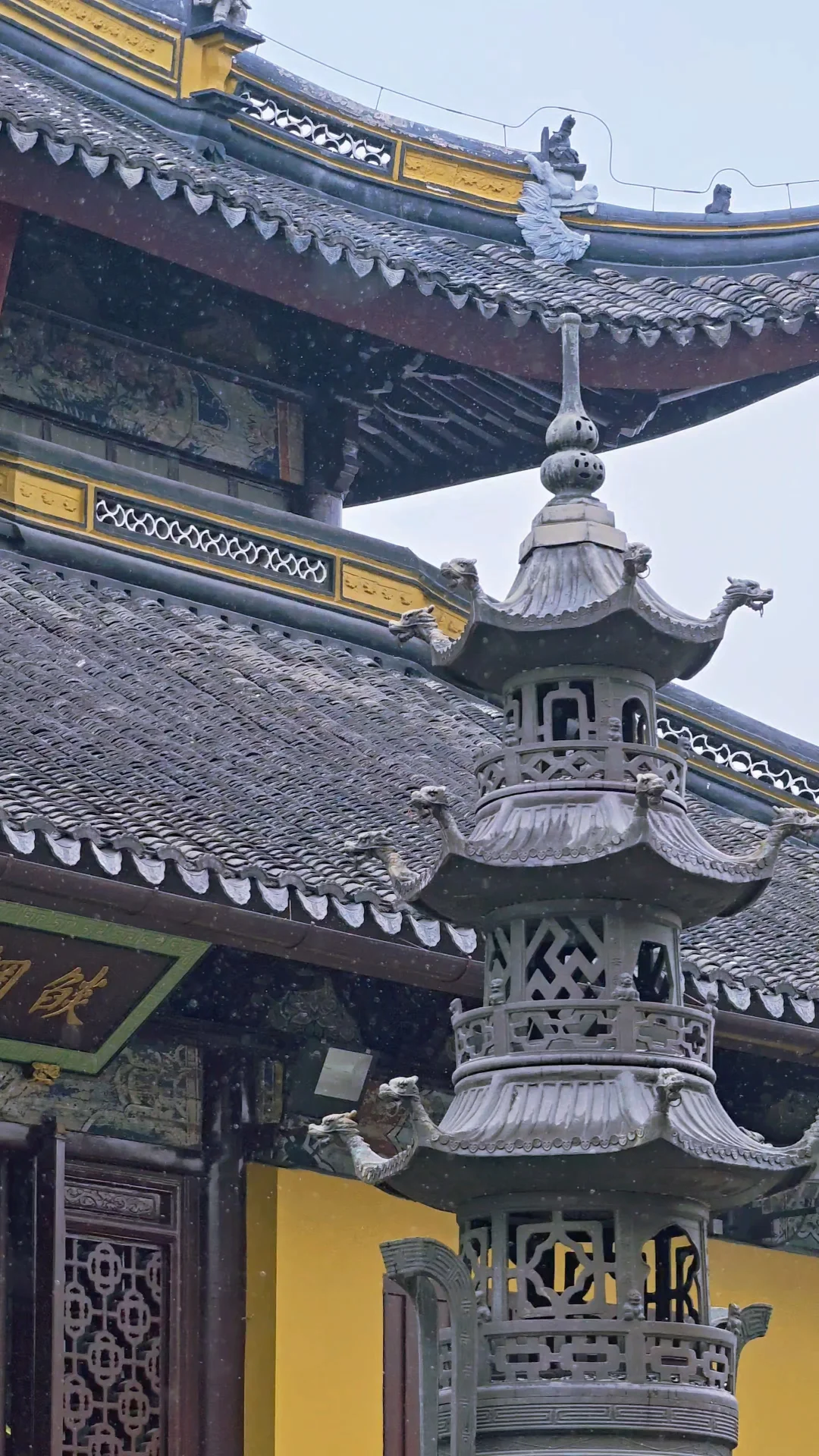 江南的雪总是矜贵的。 而西园寺的雪, 却下得格外虔诚—— 落满了黄墙、飞檐...... 大殿檐角的风铃, 每一声都敲在旧时光上。 此时方懂: “夜深知雪重,时闻折竹声”的寂静, 原是天地在诵一卷无字的经...... - 📍西园寺 -