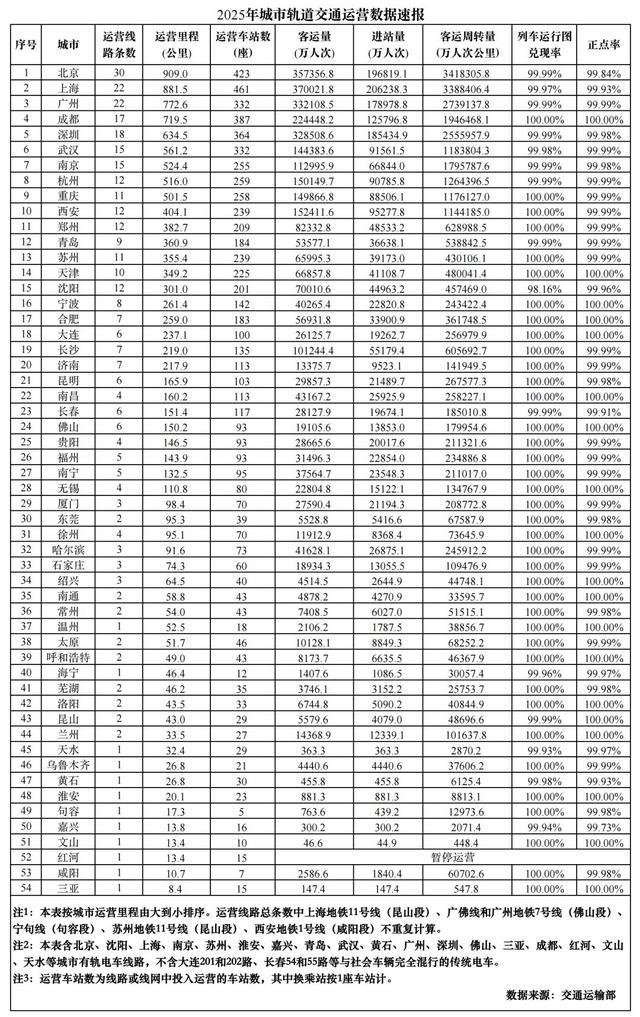 20日晚,交通运输部发布《2025年城市轨道交通运营数据速报》。