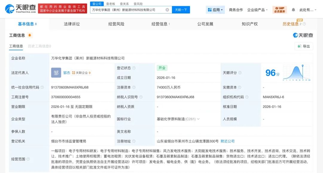 1月16日,万华化学集团(莱州)新能源材料科技有限公司成立,法定代表人为邹杰,注册资本7.4亿元人民币,经营范围含电子专用材料研发、电子专用材料制造、电子专用材料销售等。股东信息显示,该公司由万华化学(烟台)电池产业有限公司全资持股。