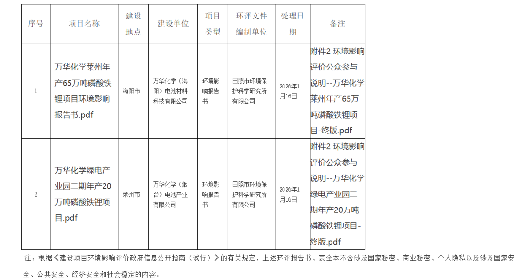 同日,万华化学莱州年产65万吨磷酸铁锂项目、万华化学绿电产业园二期年产20万吨磷酸铁锂项目两大锂电池材料项目环境影响评价文件在烟台市生态环境局受理公示。