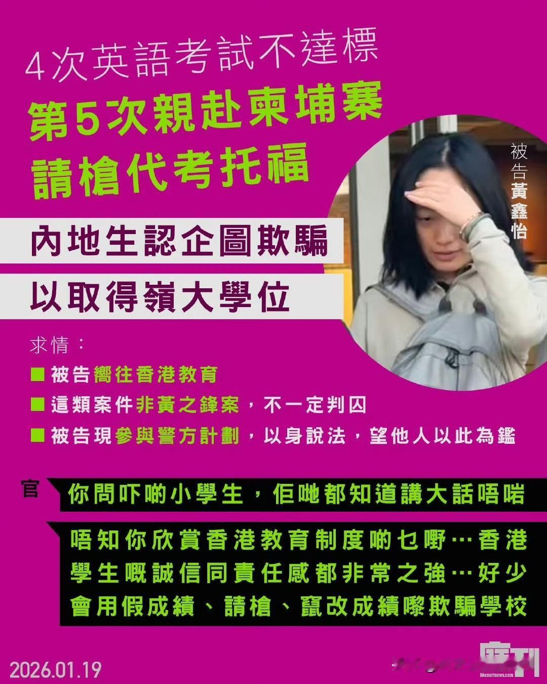 香港岭南大学,一名来自深圳的男生,在马来西亚找人代考托福(TOEFL)英语试,被校方揭发,他承认一项企图以欺骗手段取得服务罪。 男生在法庭求情时透露,过往3次考英文试不合格,才购买代考服务。他事件被揭发后,已遭校方处罚,望可判缓刑。 裁判官覃有方指被告道德价值错误,若判缓刑,会令他以为用这样的方式毕业进入社会而无需负责,同时也对努力考取成绩的学生不公,判被告即时入狱3个月。 请枪十分盛行,岭南大学另外一名内地女生,因为四度报考国际英文水平试都不达标,第五次到柬埔寨「请枪」造假,之后被揭发,承认一项企图以欺骗手段取得服务罪,下月初判刑。 来源橙新闻