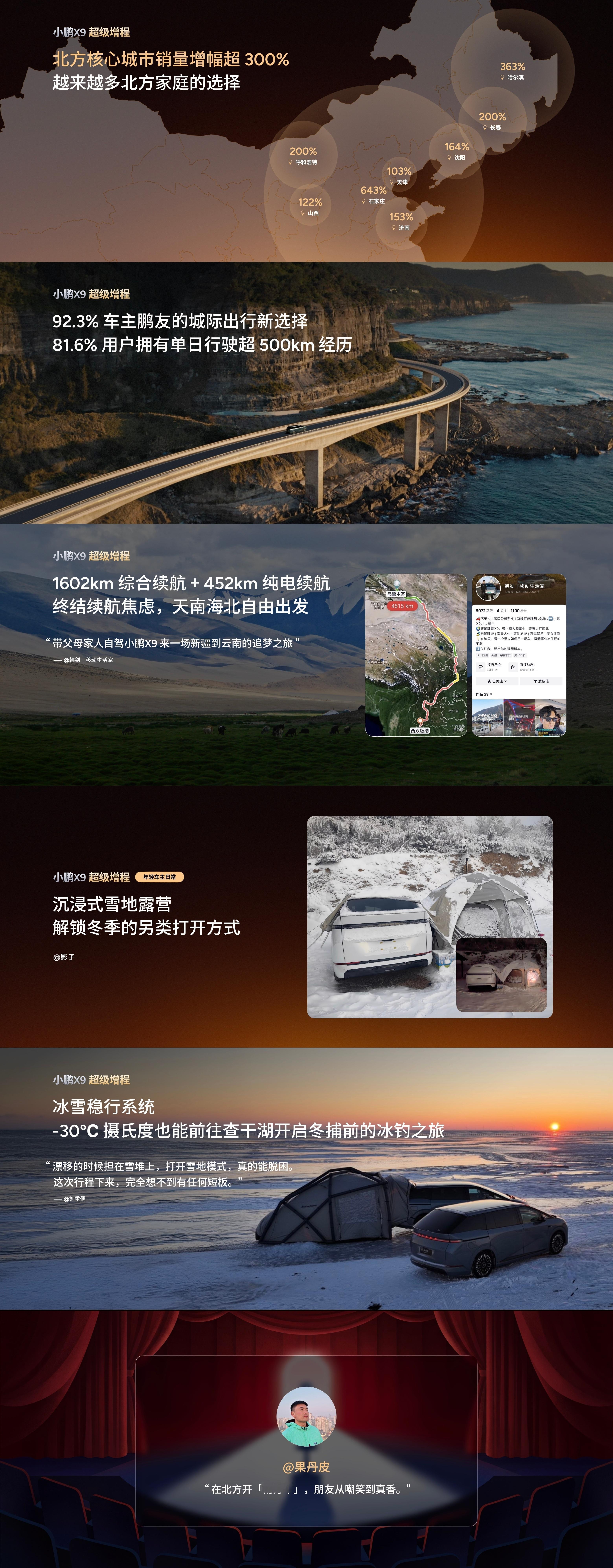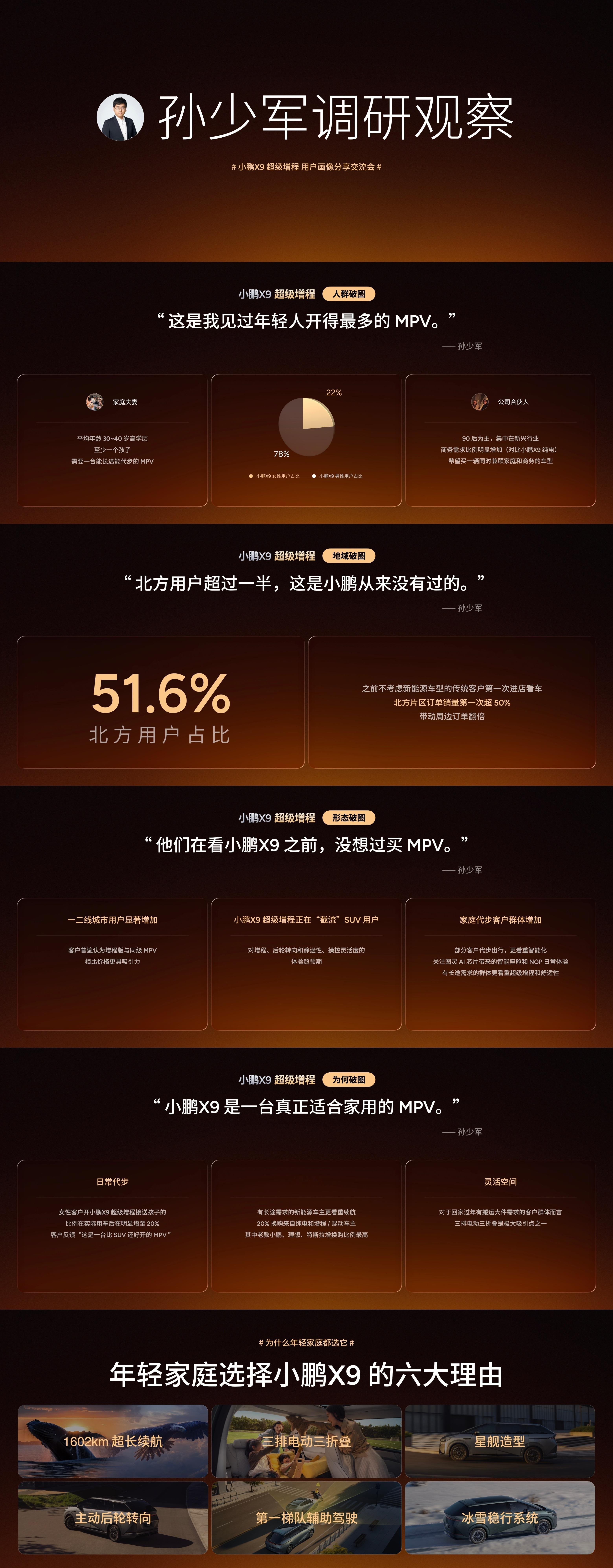「电车大卖靠油箱」,大车更如此,大型的MPV更更更如此。 在近期MPV大盘整体下滑两成的冬季氛围下,小鹏X9却走出了一条凶猛的“逆势上扬”:12月交付量同比增长289.1%,环比增长67.7% ,达到 5424 台。其中在11 月全新推出的「超级增程」版本扮演了销售主力。2023 年的广州车展,包括小鹏 X9 在内的一波电动化大型本土 MPV 进入公众视野。在这个市场长久以来被少数美系和日系 MPV 占据,本土品牌要么缺位,要么靠性价比在下方差异化的价格带生存。因此,23 年的广州车展给到公众和行业很多的关注和期待。但一苒当时第一时间保持了冷静的态度,在「电车大卖靠油箱」的历史制约下,虽然这一批电车的智能化、造型、空间、配置等有很多出色之处,但动力总成的特性和补能效率上的局限,会让大型化、多人化的交通工具,难以满足各个方面的挑剔。所以我一直认为,谁先给这批优秀的大 MPV 安上油箱,谁就占据一定的先发优势。我一直以为擅长增程的另一家头部新势力会最先装上油箱,没想到还是小鹏 X9。另外值得注意的是 X9 的差异化定位,依托小鹏品牌一贯「年轻化、智能化」的标签,也结合这款车相对更进取、创新的造型风格(比起传统的稳重风格的同级别作品,这款车更让人联想到星际飞船的概念,同时在版本更新后,造型在新锐的同时更加和谐耐看)和内饰百变空间的大胆设计(强悍的得房率,和多变的座椅布置可能性),让它不仅能服务中年人,也能吸引很多年轻用户。在老朋友X9 用户群体的一些特性。1.近六成 90 后车主:印象中这个尺寸的 MPV 用户起码比一苒更成熟?但其实X9车主中90后占比近六成(57.2%),00后占比更是行业平均水平的近7倍!一些年轻家庭甚至跳过了轿车和SUV,直接把X9作为人生的第一台车(首购比例21%)。MPV 是通常是一种需要一定的「汽车阅历」才会在私人购买中选择的产品,MPV 的逐渐流行化,其实是我们车市越来越成熟的一个见证。我的另一位老朋友,知乎老炮儿作者,多台 MPV 的忠实用户高小强同学,一直说:「真男人开 MPV」。2.北方不再是电动 MPV禁区:超级增程 彻底消灭续航焦虑和严寒焦虑,CLTC综合续航1602km以及冰雪稳行系统,让X9在北方核心城市销量暴增超300% 。3.大车也可以好开:很多 MPV 都不好开。我还有一位老朋友羽毛哥家住常州,是蔚来和小鹏的长期拥趸。我唯一一次驾驶 X9,就是他亲自来常州高铁站接我时,我说想试试他的车。这款车开起来完全没有羽毛哥讲话的那种登味,可以说让人更多想起米,看似庞然大物,但配备了主动式后轮转向后,拥有5.4米的灵巧转弯半径,比特斯拉Model Y转弯还短,比很多大家熟悉的紧凑级轿车都短。你不试试会很难感受这种感觉。这也解释了为什么X9的女性车主占比高达22%(行业平均的5倍)。当然,我这里并没有说女性开车技术不好的意思。小鹏X9年轻家庭的第一台MPV 小鹏X9超级增程用户画像