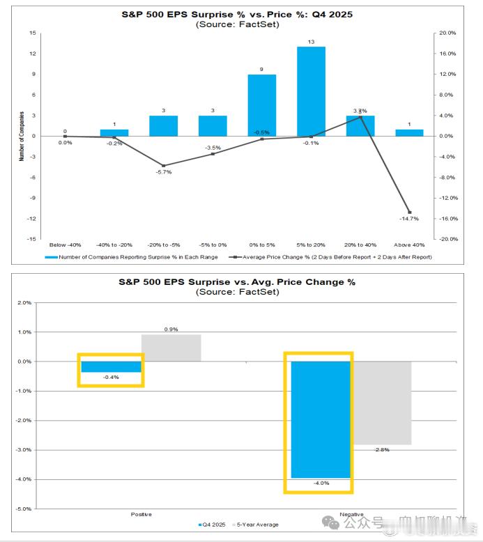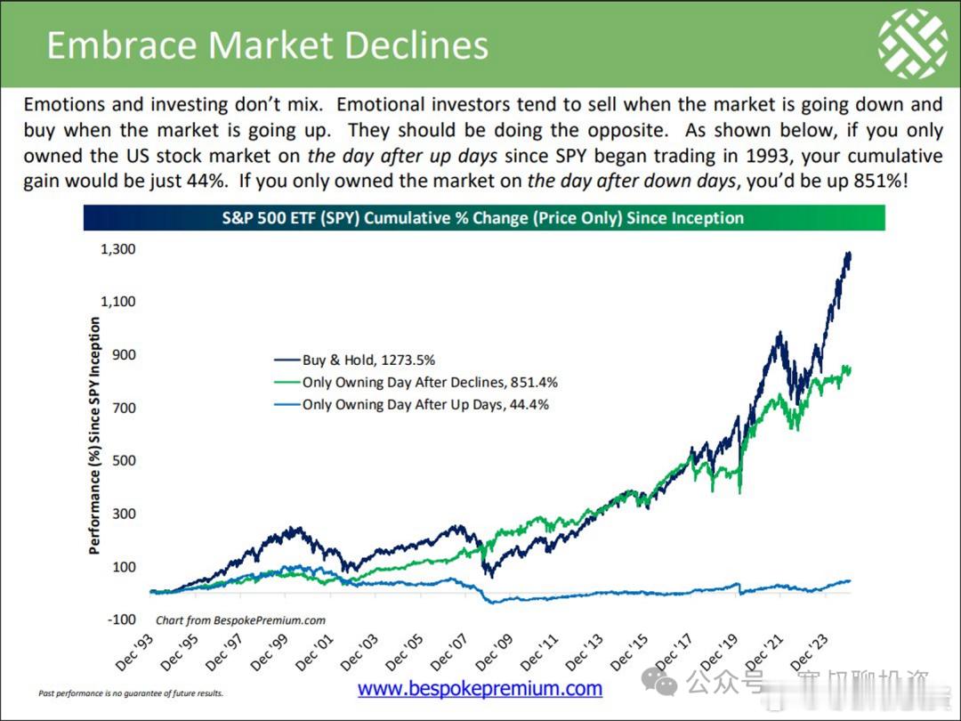 美债抛售、丹麦清仓,达利欧看空,我们应该恐惧还是贪婪(3)我反复强调,不要根据突发消息进行操作。 无论是战争冲击、关税升级,还是关税缓和带来的暴涨,真正影响股市长期走势的,永远不是突发事件本身,而是经济周期、流动性和企业盈利。(图1)根据消息追涨杀跌有什么坏处,下面这张图给了我们一些启示(图2)深蓝色线(买入并持有):1993-2023年,30 年累计收益 1273%。绿线(仅在下跌后一天持有):即“抄底模式”(美股一旦下跌就买入,上涨就卖出),30 年累计收益 851%,收益不错最底下的线(仅在上涨后一天持有):即“追涨模式”(美股一旦上涨就买入,下跌就卖出),30 年累计收益只有 44.4%!结论非常反直觉:长期看,美股一旦下跌反而是买入机会;而一旦上涨去追买,收益甚至不如定存。根据历史统计,Vix在一天内上升26%,并且标普在新高下跌小于3%以内,未来1周到一年大概率正收益(图3);我认为未来一段时间大概率有反弹,但是对未来一年正收益且收益不低,保持谨慎态市场正从七大巨头向其他板块扩展7巨头横盘的时候,更多比例股票上涨,下图蓝色是市场宽度,就是高于50日均线股票的比例(图4)美股和全球也是类似的例子,上涨从7巨头扩撒到标普493在扩散到全球昨天和4月突发加征关税造成突发的小型流动性危机有些不一样,前者短期造成美债黄金都抛售,两者都下跌;昨天美债下跌,黄金上涨,是因为市场担心美元信用和美国财政纪律,担心未来滥发债;美股这次下跌,表面原因是关税、地缘、美联储独立性,但本质原因是:1、高估值与高预期:目前的高股价包含了对未来极度乐观的预期。涨多了之后,市场变得脆弱,一点风吹草动(如关税影响通胀),波动就会被放大。如果没有关税,下跌之后媒体也会找其他原因来合理化解释下跌2、盈利与估值的双杀担忧:关税可能引发通胀 -> 联储维持高息 -> 压低估值;同时如果企业盈利不及预期 -> 股价下跌。有没有依据?有:业绩兑现的“不对称博弈”——超预期无奖励,不及预期遭重锤。根据 FactSet 数据,本季度财报季呈现出极端的“风险收益不对称”特征:(图5)利好变利空: 业绩超预期不再带来超额收益。报告发布前后的股价反应均值仅为 -0.4%,不仅远低于五年历史平均水平(+0.9%),甚至比前两个季度的微弱涨幅(+0.4%)进一步恶化。利空遭血洗: 业绩不及预期的惩罚依然残酷,股价平均下跌 -4.0%。虽然较二季度的极端值(-5.5%,创2000年以来最差)有所收敛,但仍接近五年平均惩罚幅度(-2.3%)的 两倍。原文:网页链接